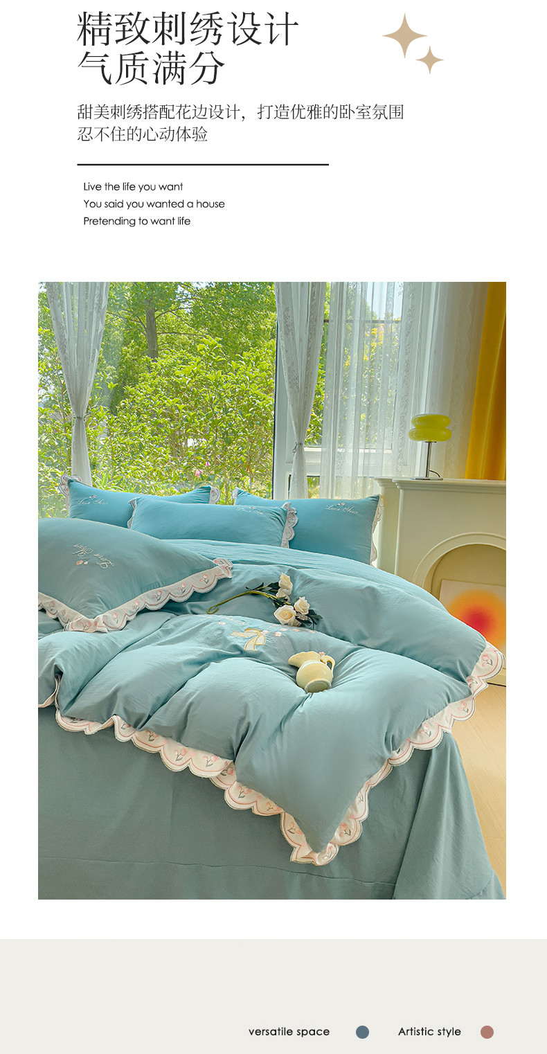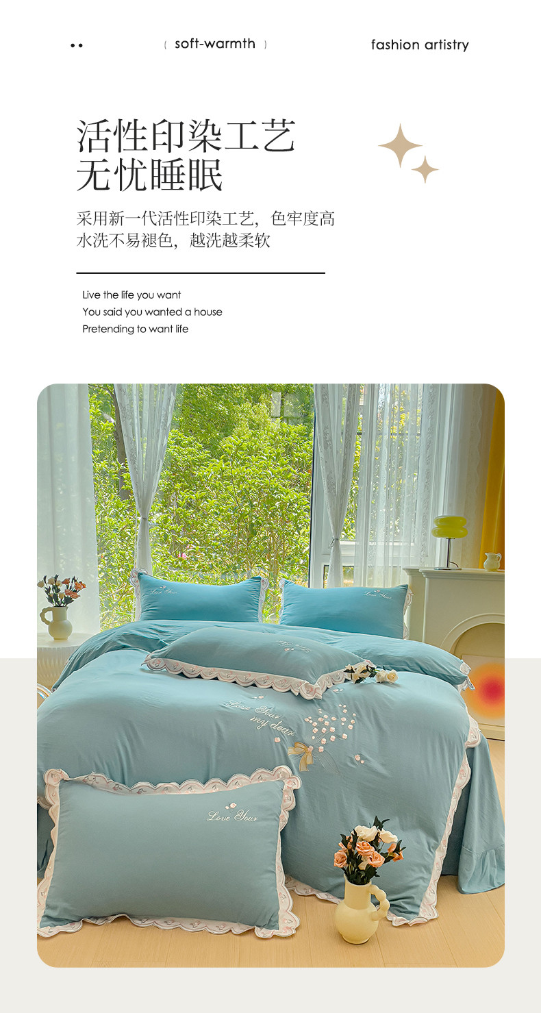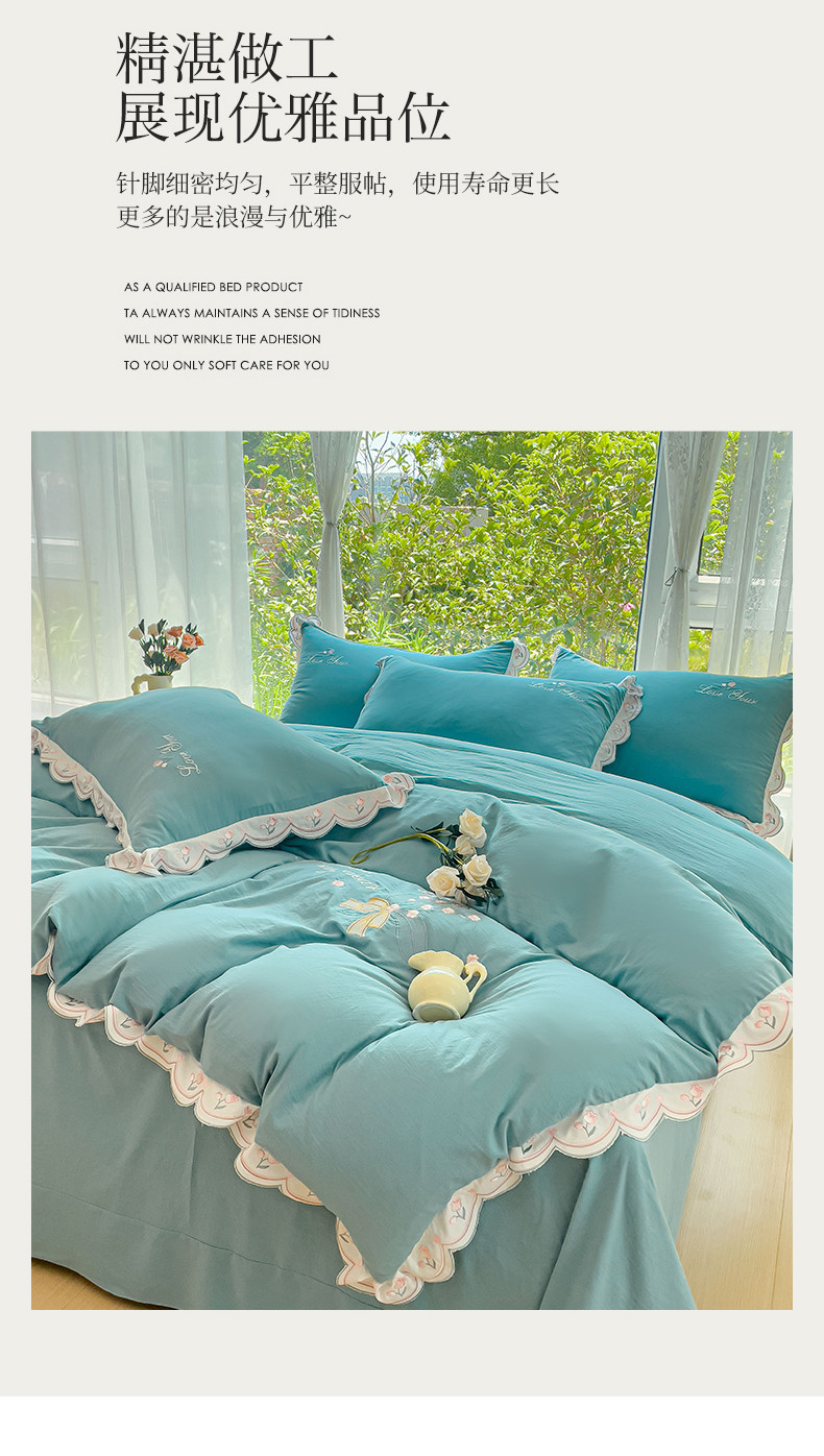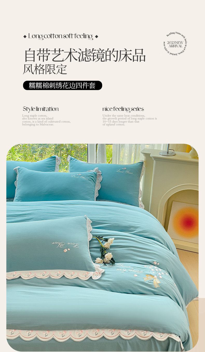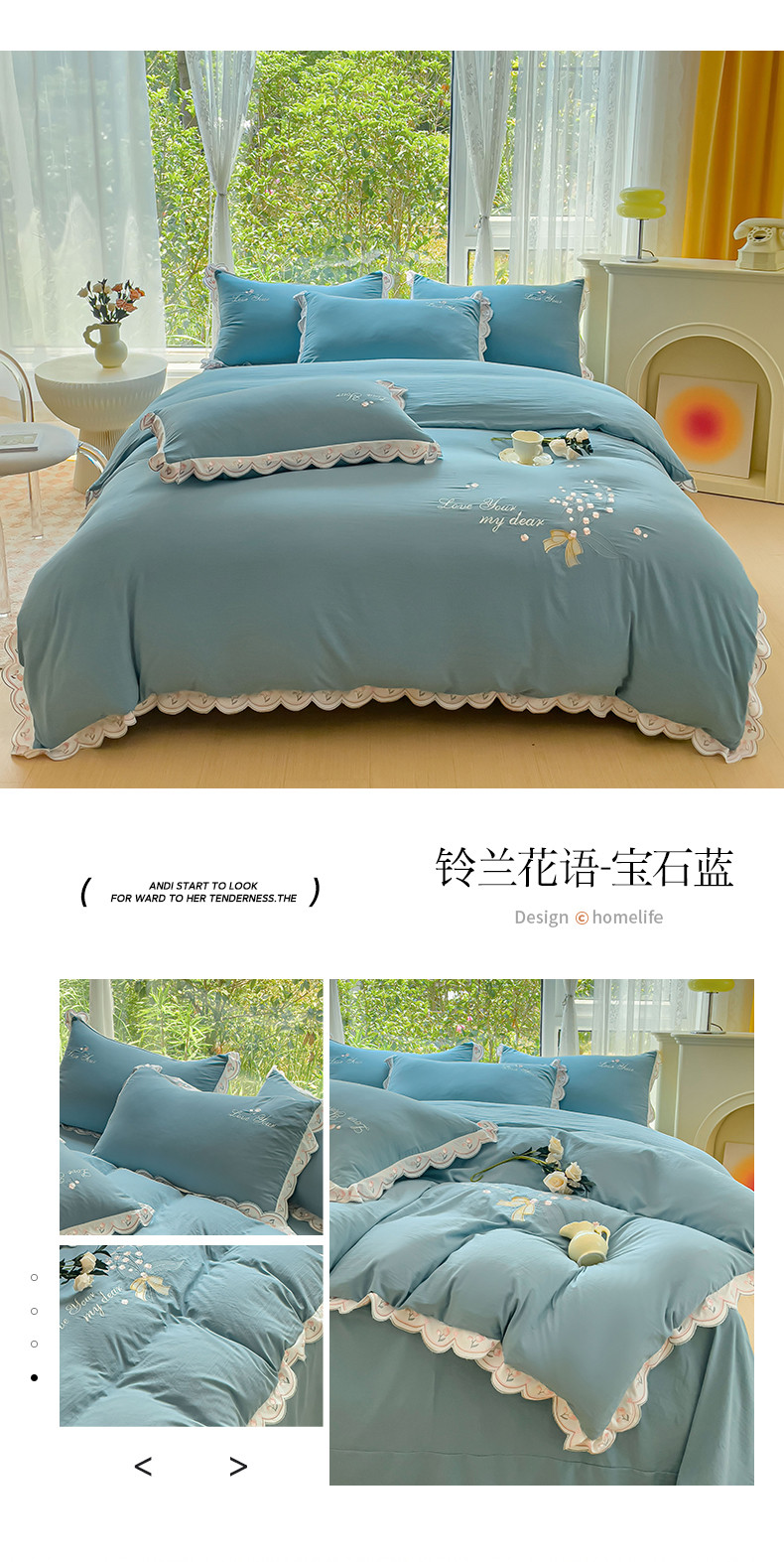 雪夫人 2023新款糯糯棉刺绣花边四件套铃兰花语 铃兰花语-宝石蓝