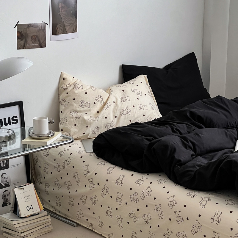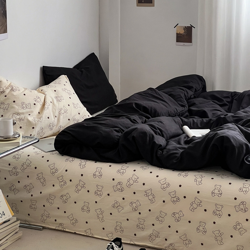 商品名称:直播热款水洗棉双层纱四件套碎花简约风床单单品单件 闪耀黑+小熊院长