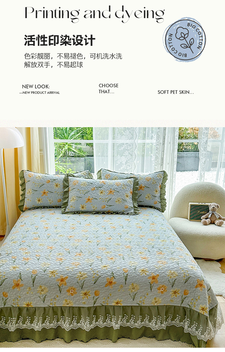 (总)艺慕 2025新款双层纱水洗棉麻蕾丝花边床盖,春意,粉色玫瑰,红豆,青花瓷,太阳花绿,屋顶花园,夕颜,夏日仙草,心动绿,萌兔子,花丛兔