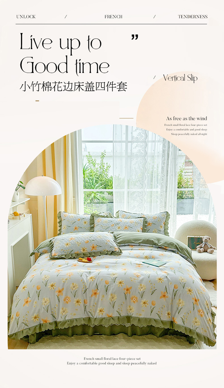 艺慕家纺 2025新款水洗棉麻双层纱夏被床盖四件套 绿藤花语,绿藤花语