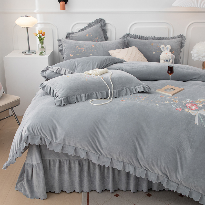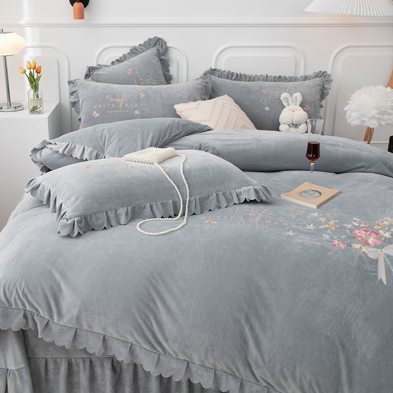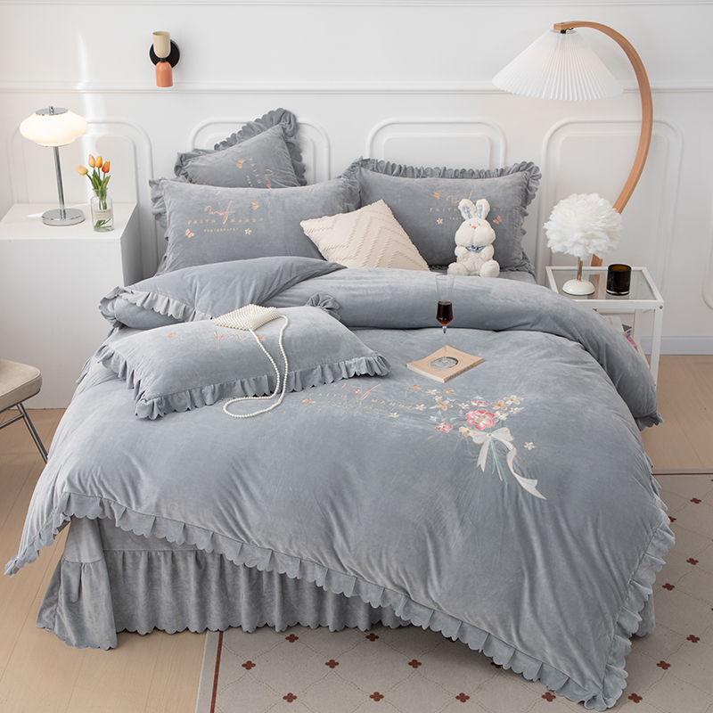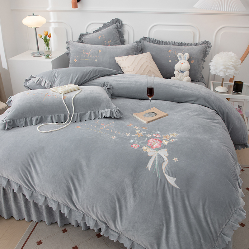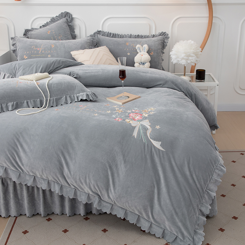 床品套件 > 优姿家纺 2024新品8.5斤德芙绒韩版床裙绣花保暖四件套 今生有约绅士灰