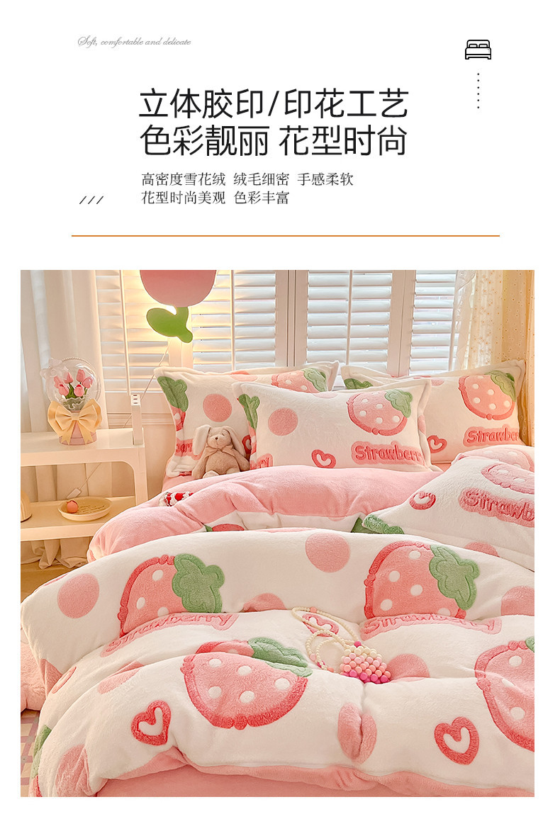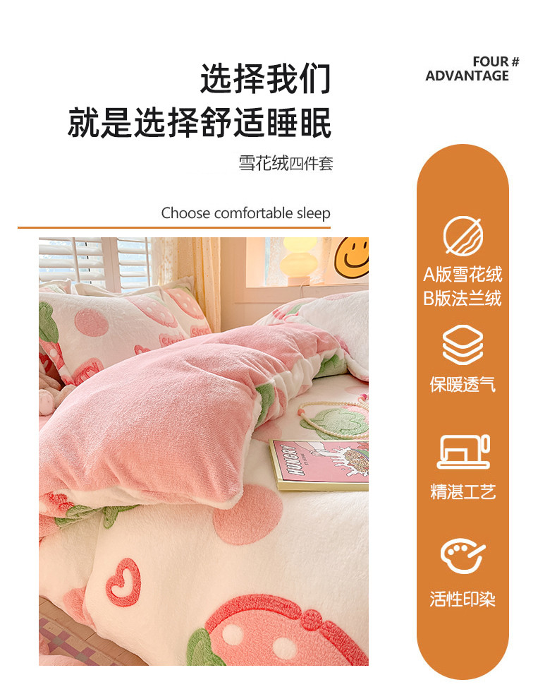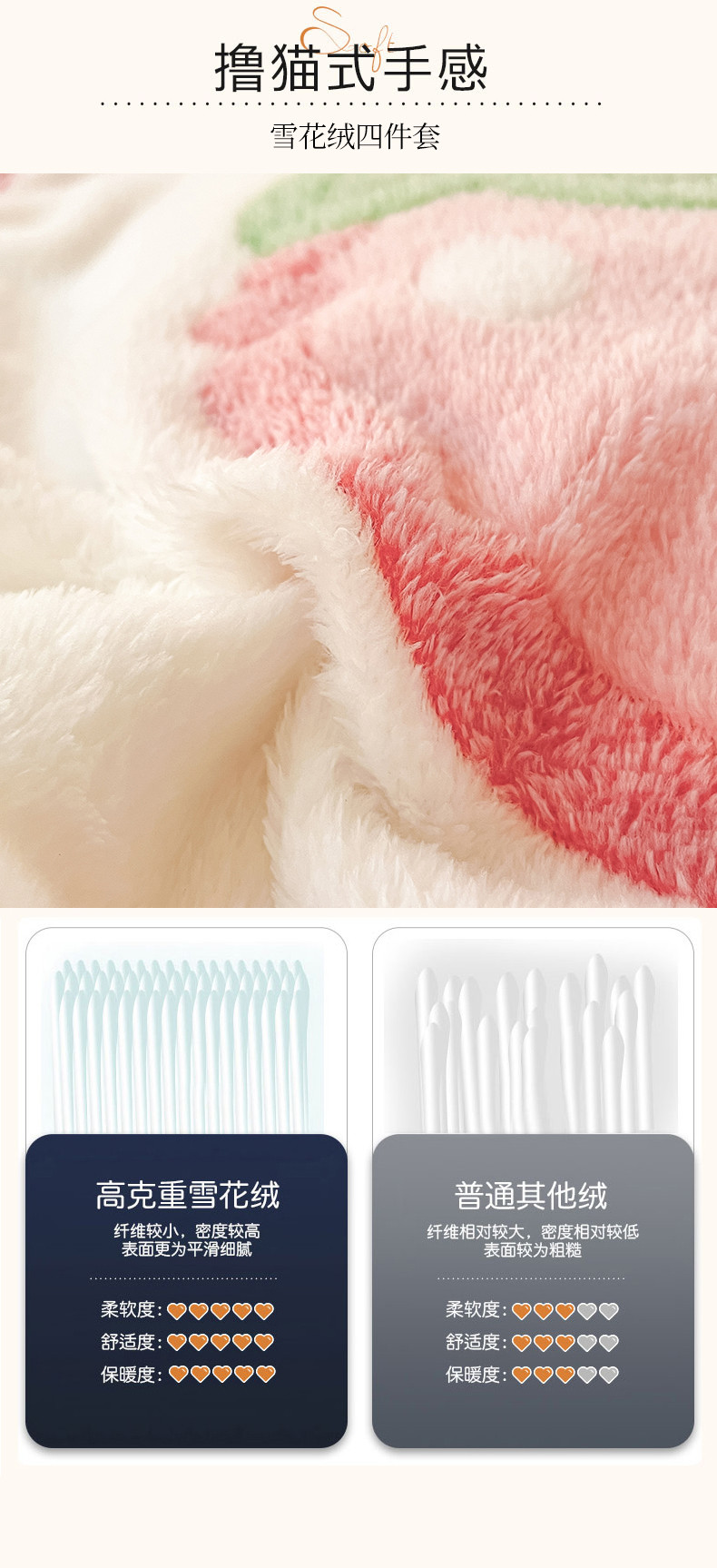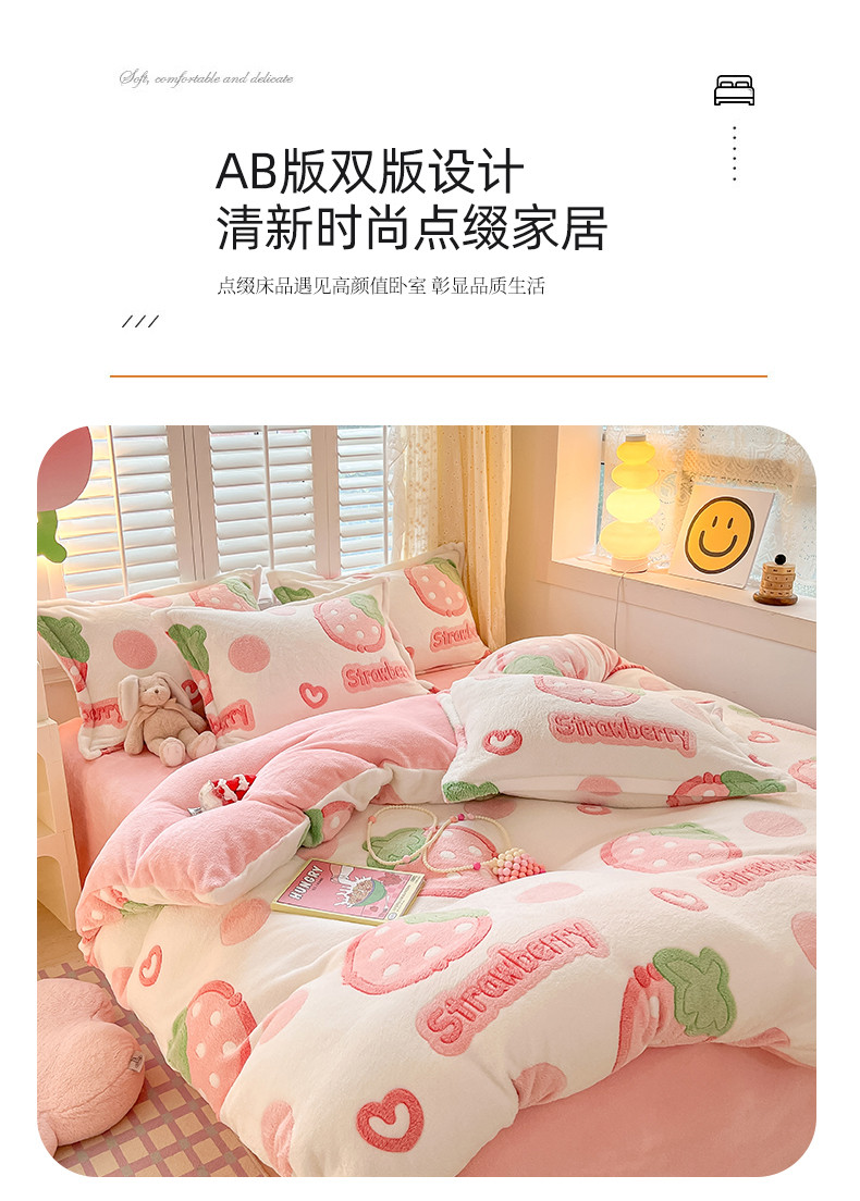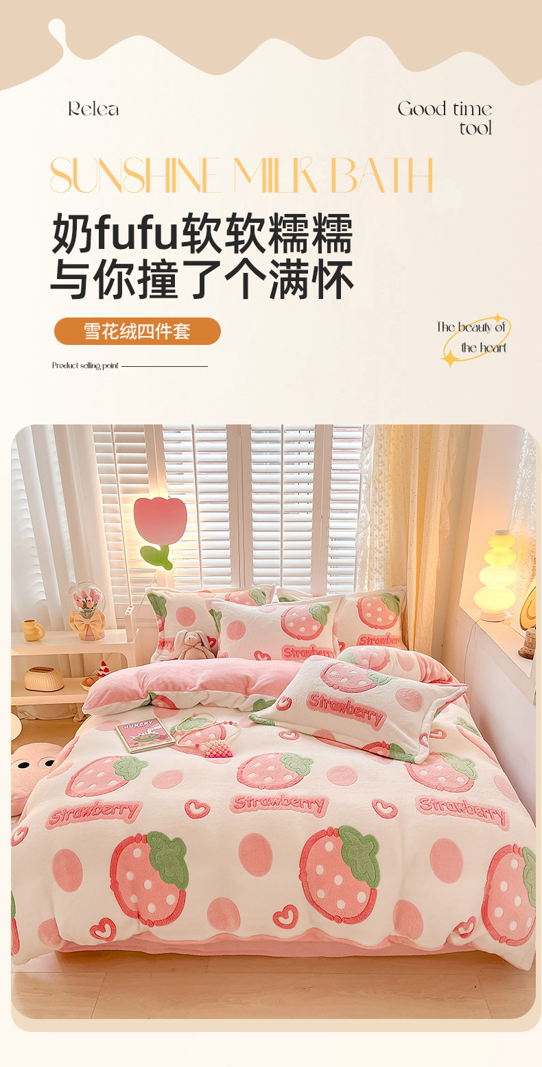 当前位置: 91家纺网 > 商品网购 > 床品套件 > 四件套 > 磨绒四件套 > 川悦生活 2023新款立体雪花绒四件套 啵啵草莓