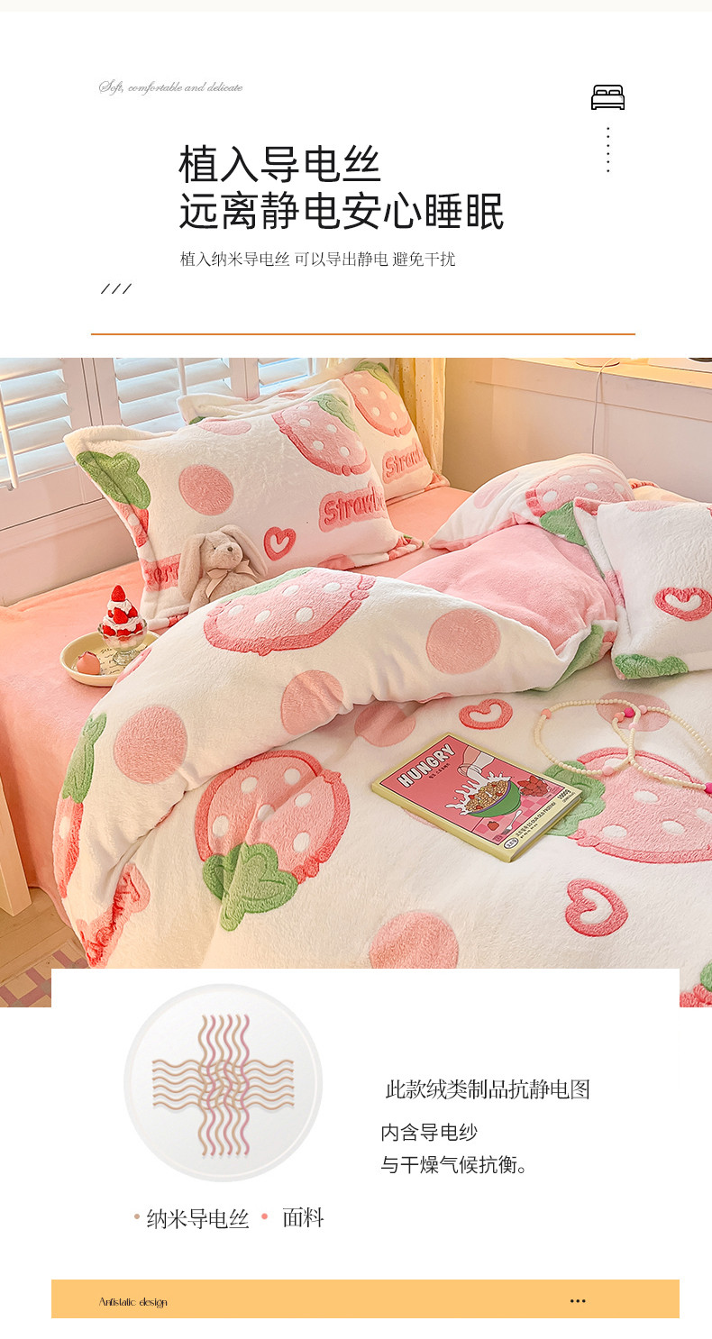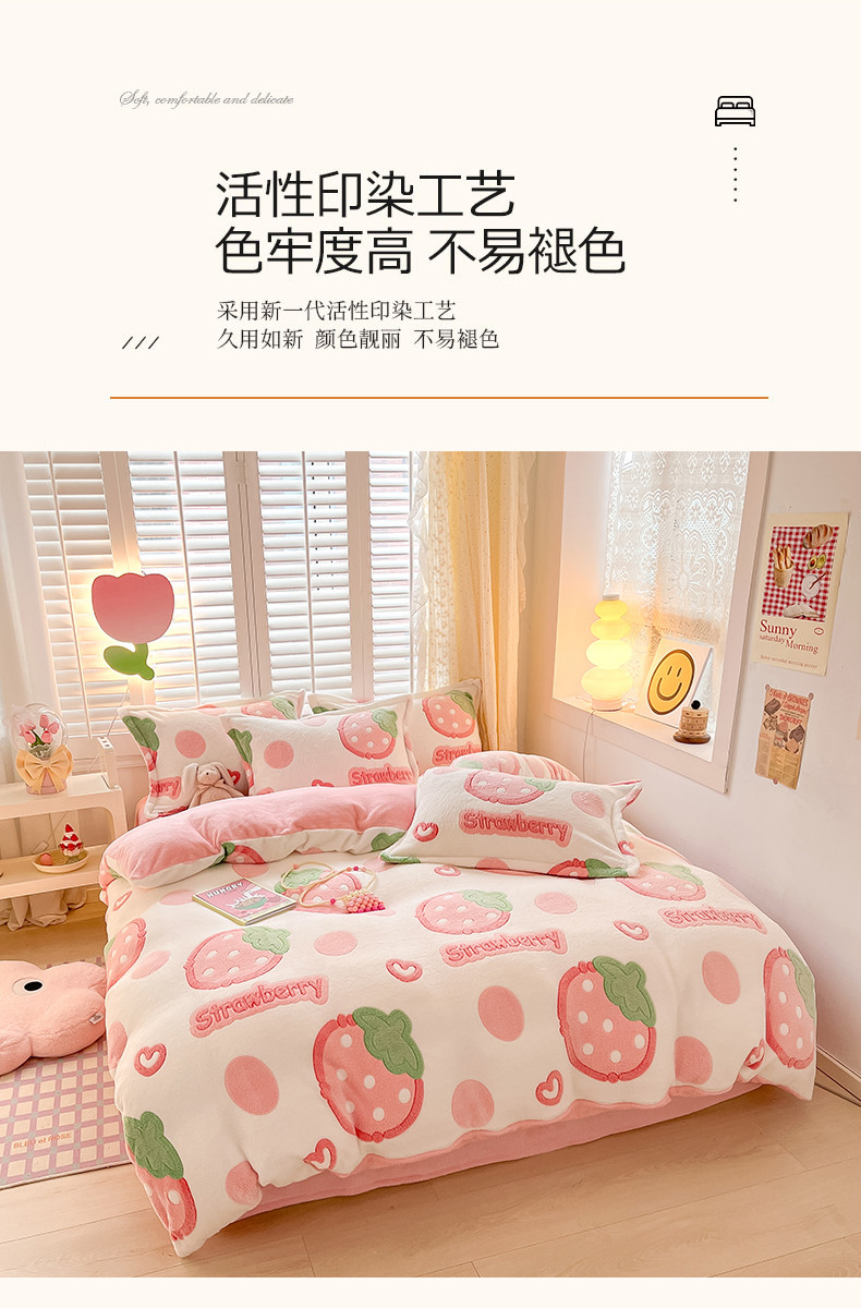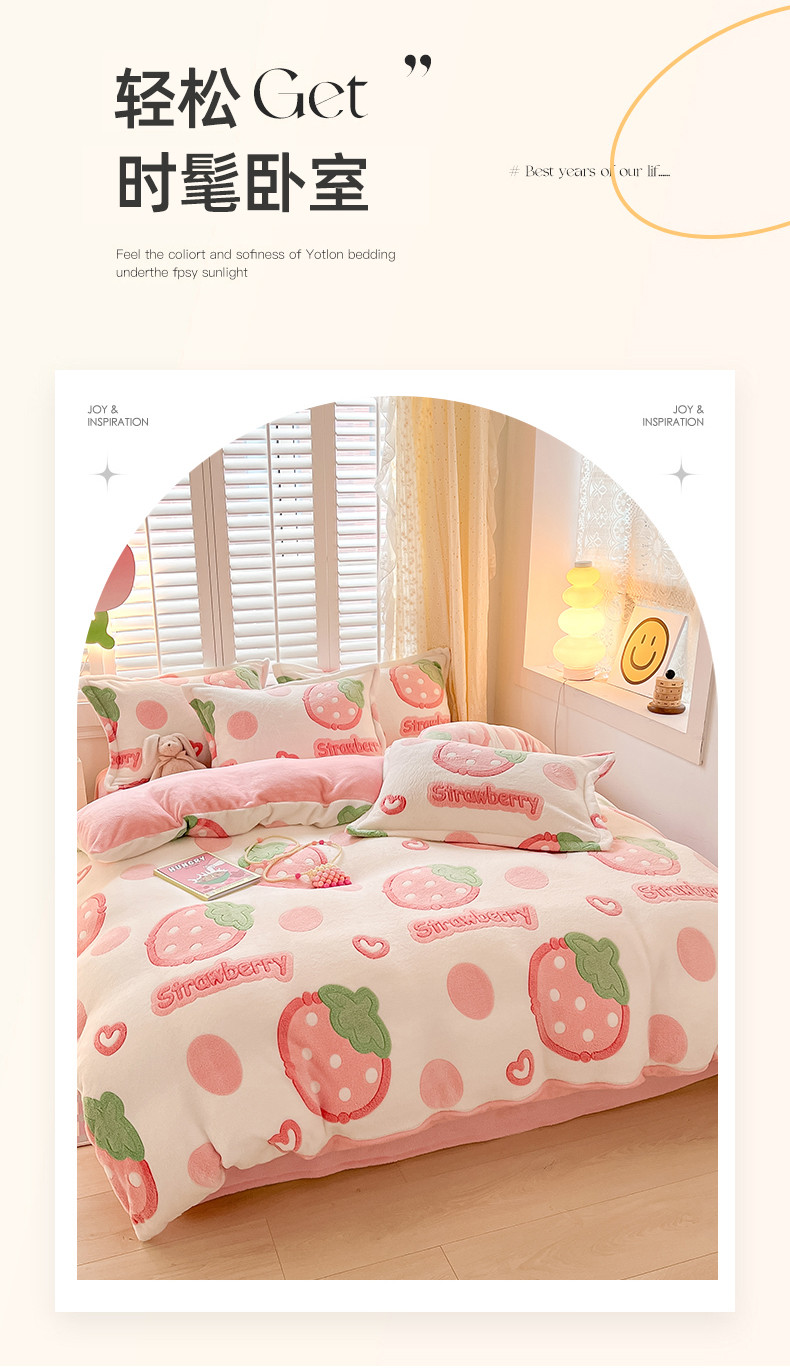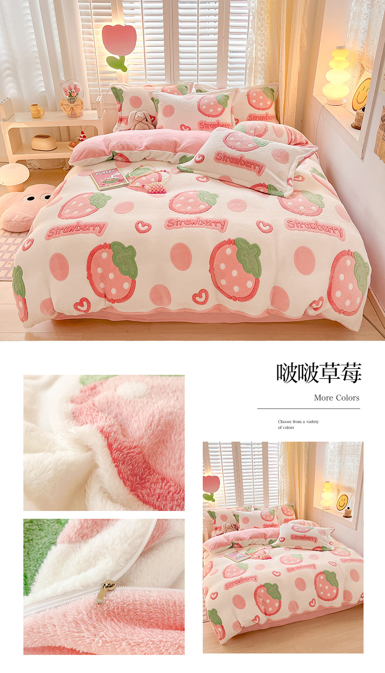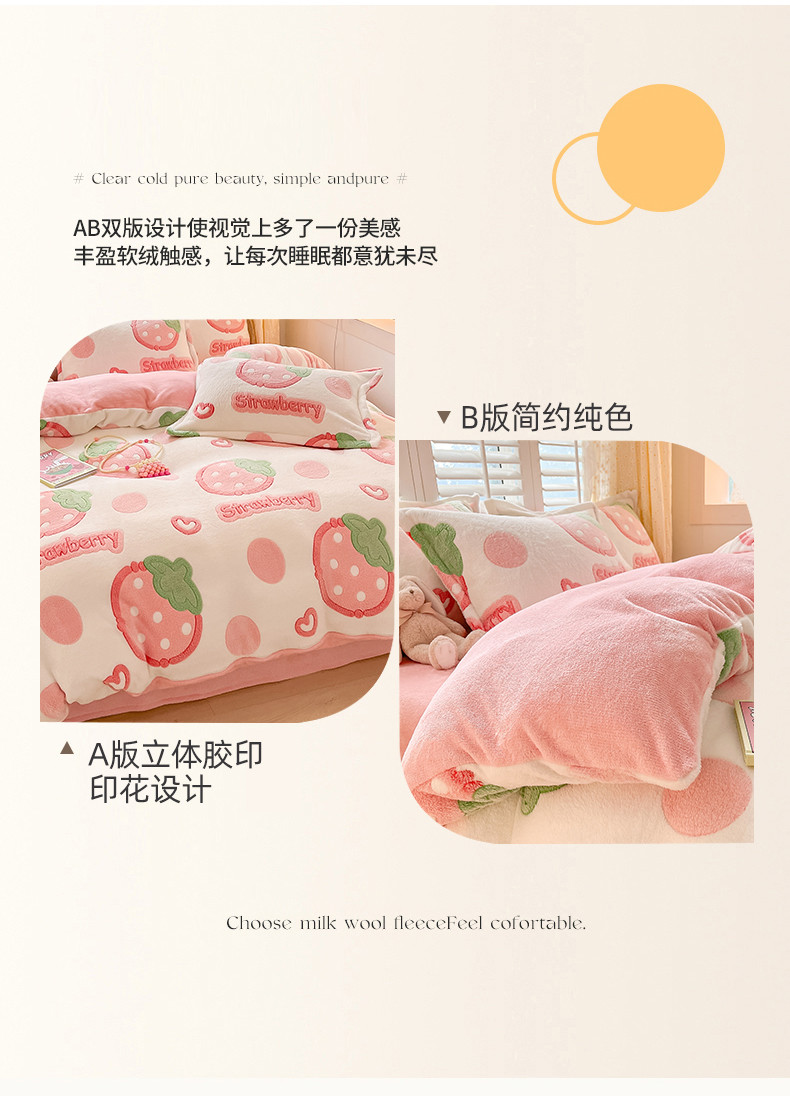当前位置: 91家纺网 > 商品网购 > 床品套件 > 四件套 > 磨绒四件套 > 川悦生活 2023新款立体雪花绒四件套 啵啵草莓