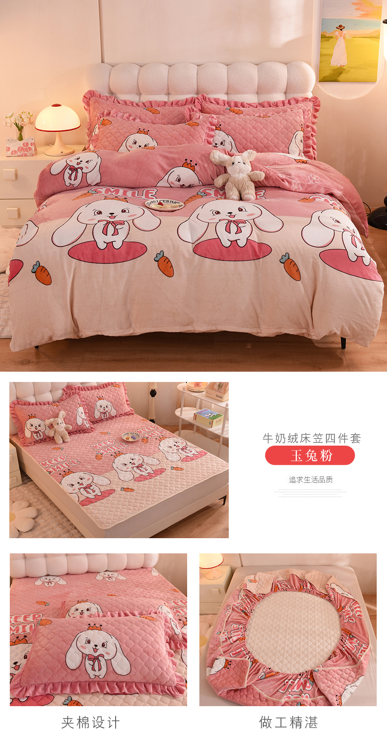 商品名称:美达 2025新款A类牛奶绒印花床笠款四件套 玉兔粉