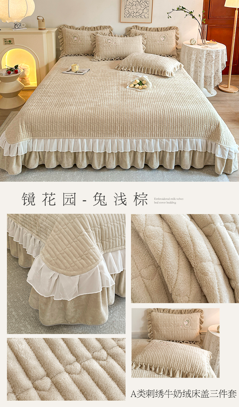 商品名称:宜凡家纺 2023新款高克重牛奶绒绣花夹棉床盖三件套 镜花园-兔浅棕