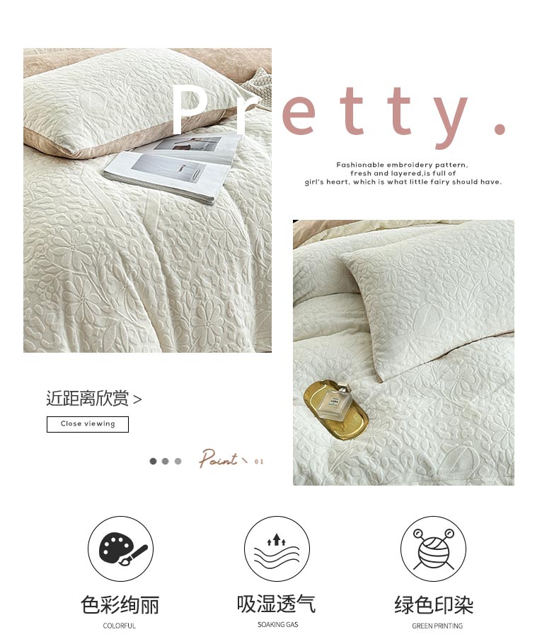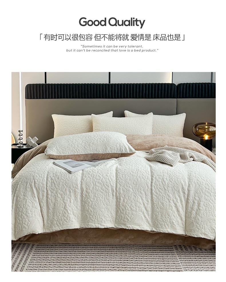 铠畅家纺 2023爆款A类230g立体雕花牛奶绒四件套 飘逸奶白