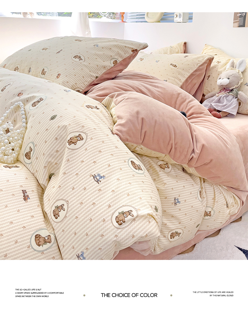 盛馨家纺 2023新款棉加绒A版高支高密13372全棉加B版加厚宝宝绒牛奶绒床单床笠四件套 幸运熊
