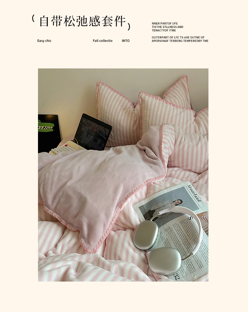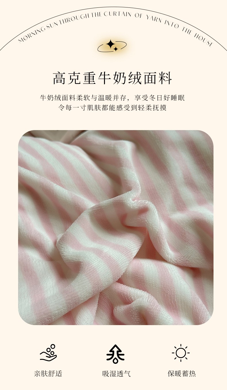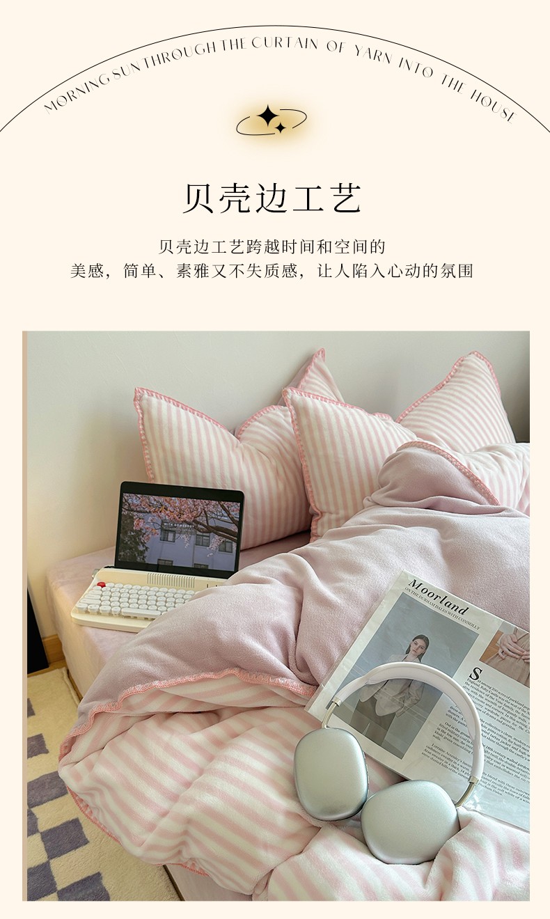 商品名称:三朵 2023新款无印风牛奶绒四件套 樱花粉细条
