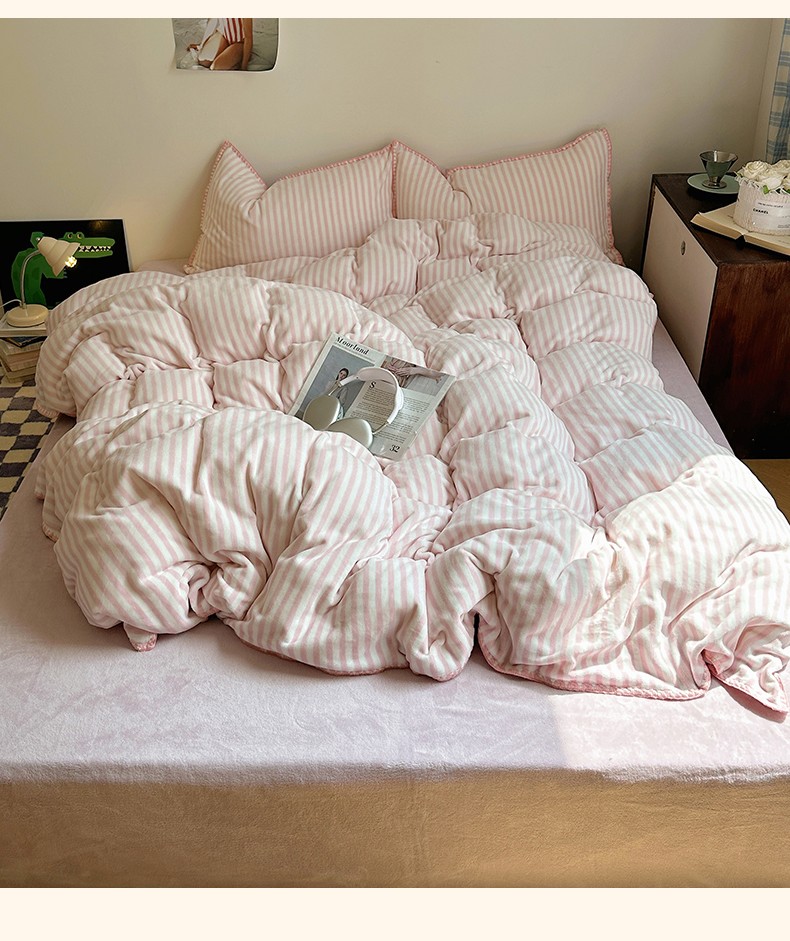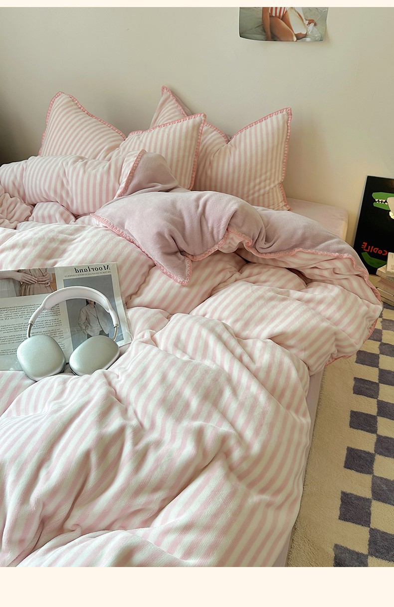 三朵 2023新款无印风牛奶绒四件套 樱花粉细条