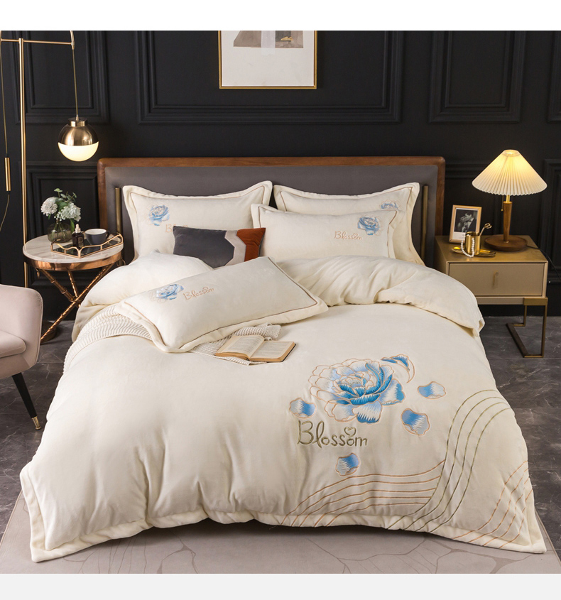 找底底家纺 2023款9斤全消光9斤重工刺绣纯色牛奶绒四件套-富贵花开 富贵花开-白色