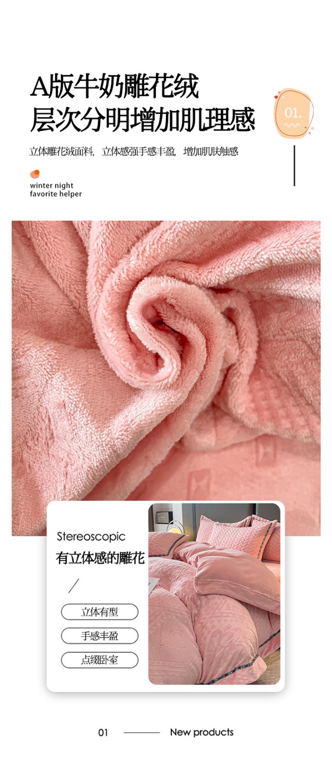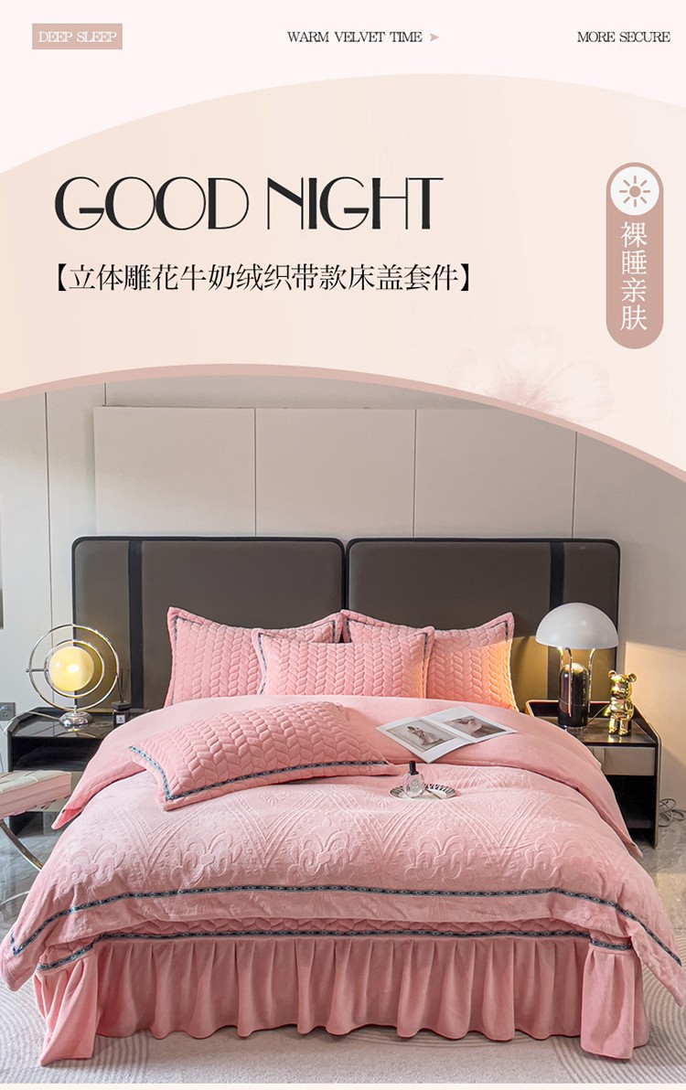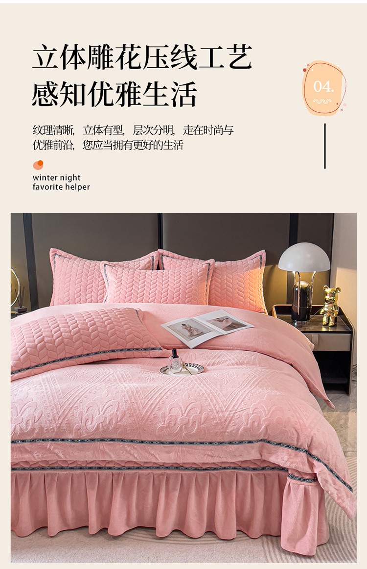 商品名称:佰诗特 加棉加厚立体雕花绒织带款床盖四件套 高克重牛奶绒夹棉床盖三件套