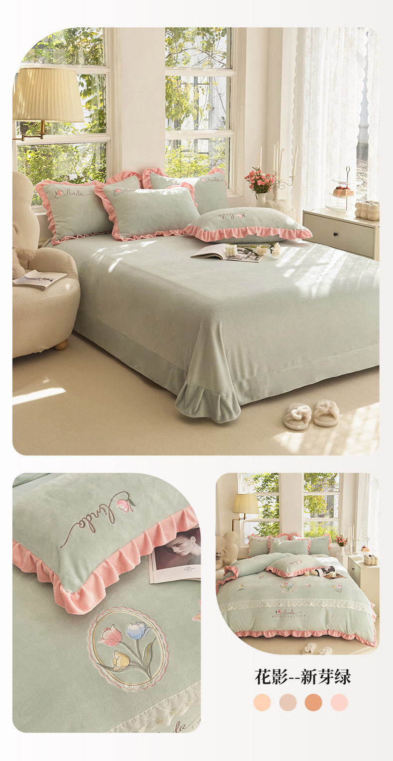 (总)卡初家居(原微来) 2025新款秋冬亲肤牛奶绒绣花四件套-多喜系列,多喜-豆沙,多喜-果绿,多喜-米黄,多喜-浅紫,多喜-桃粉,多喜-天蓝