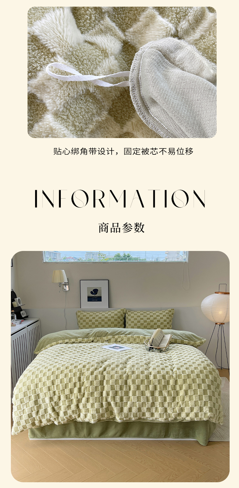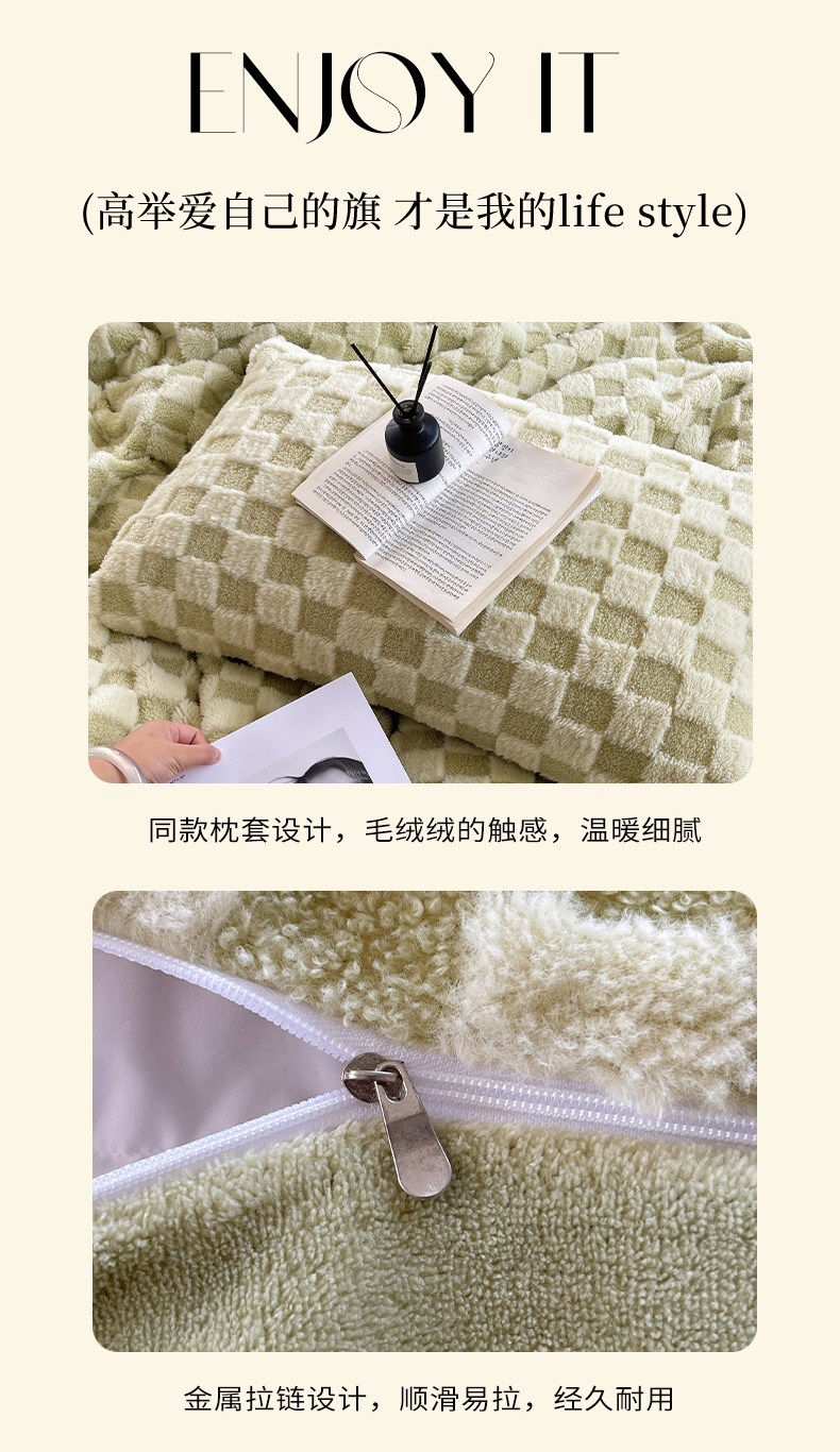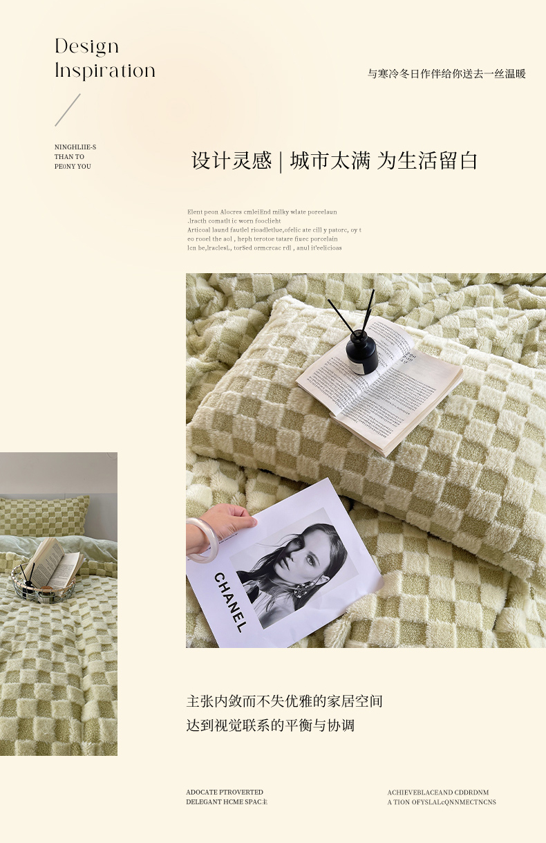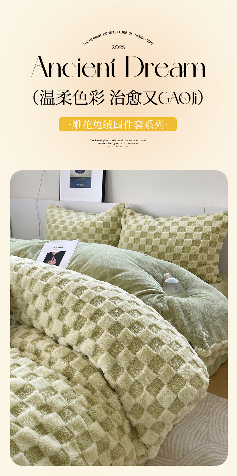 商品名称:三朵家纺 2023新款加厚保暖雕花兔毛绒四件套 棋盘格-橄榄绿