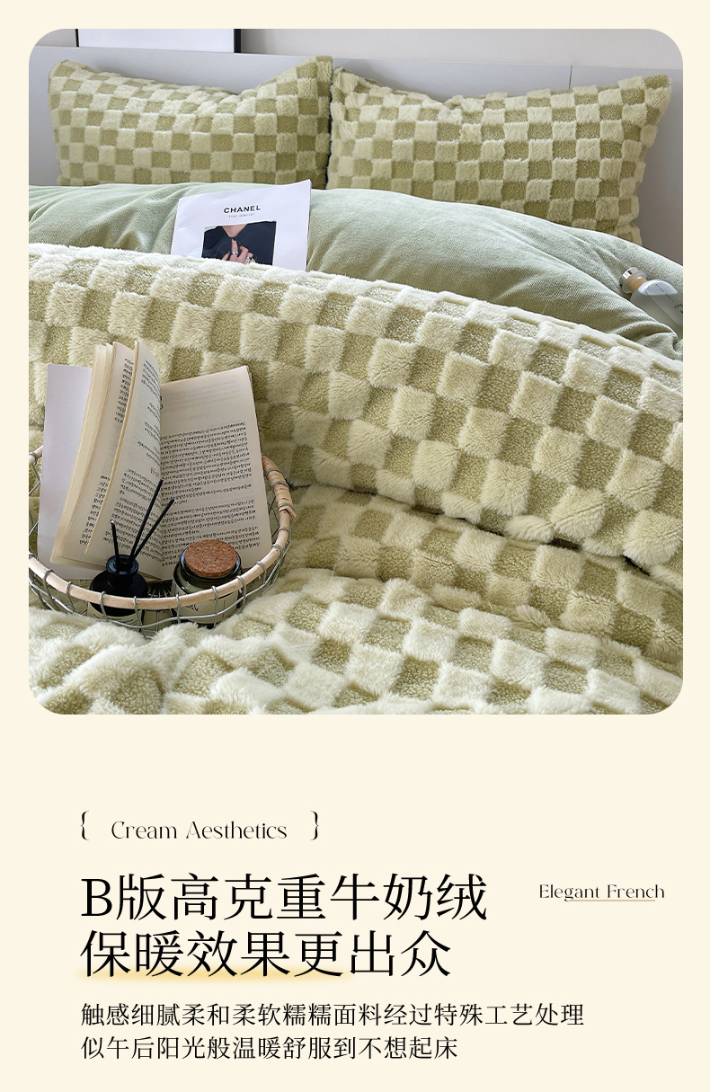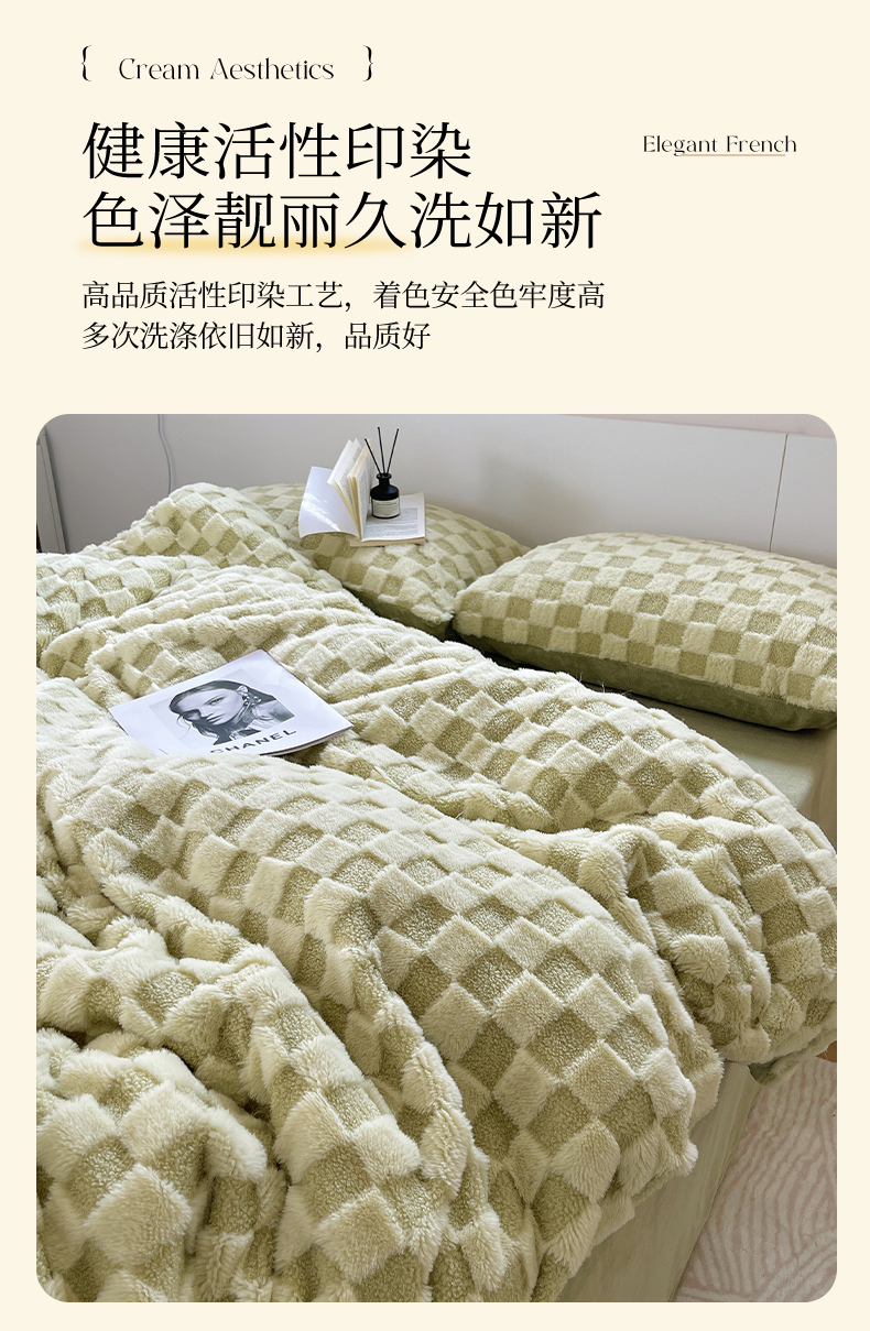 三朵家纺 2023新款加厚保暖雕花兔毛绒四件套 棋盘格-橄榄绿