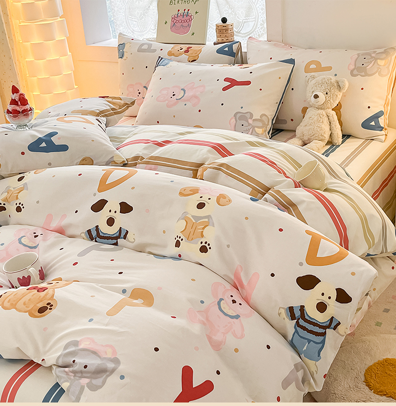 (总)曼之夏 2025新款全棉纯棉40支学生季卡通印花四件套,椰蓝小腊肠,茶茶狗,格子猫,嗨皮狗,开心屋,可爱多,可可汪,玛奇朵,奶昔小熊,泡芙小象,曲奇小狗,趣味熊,甜甜圈,甜心猫咪,童画,小狗日记,樱桃熊仔