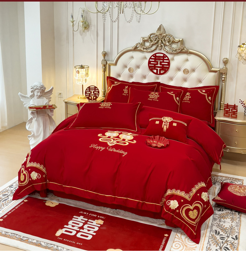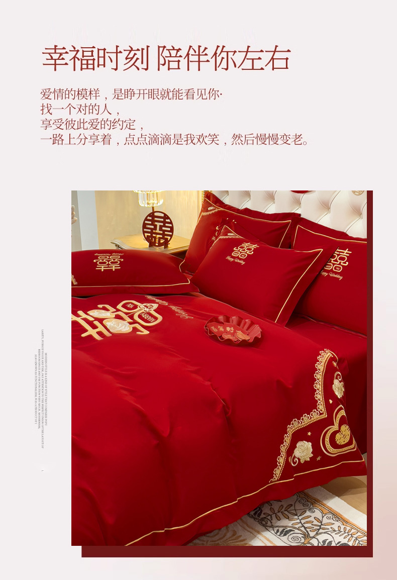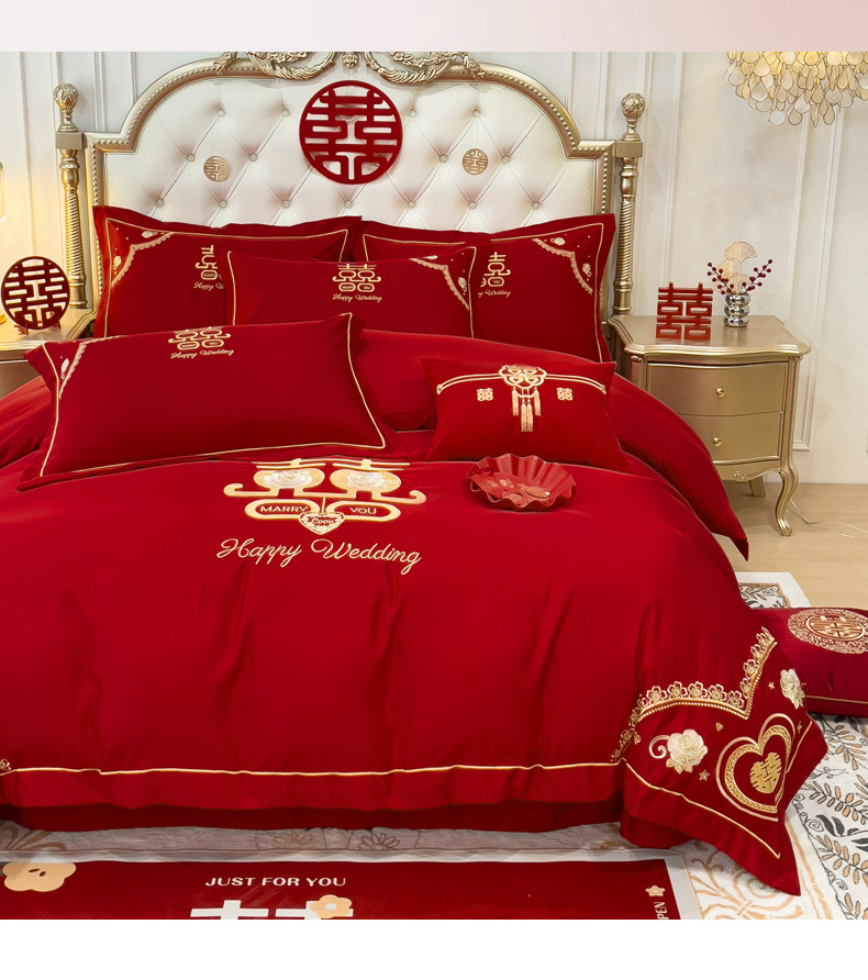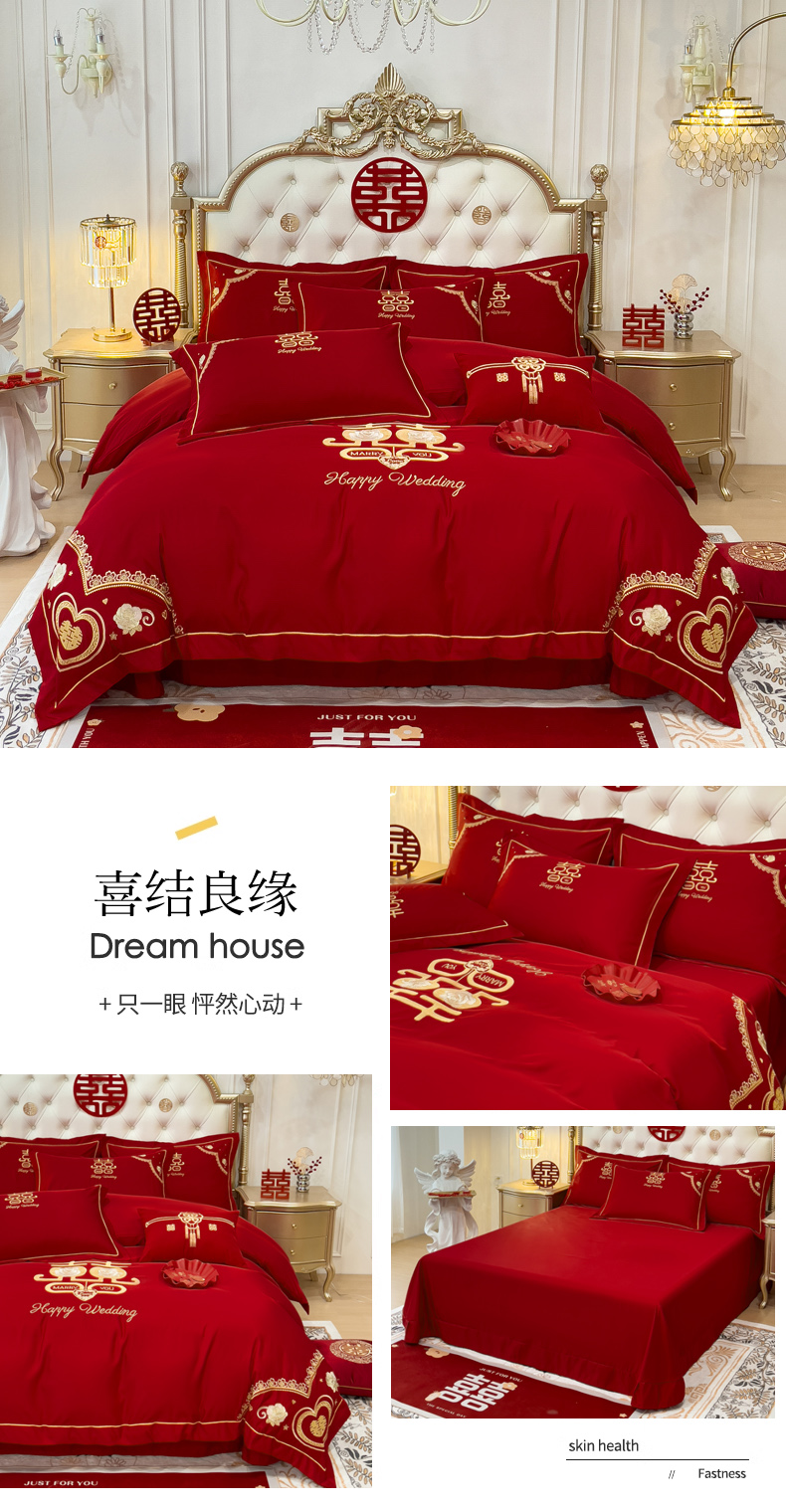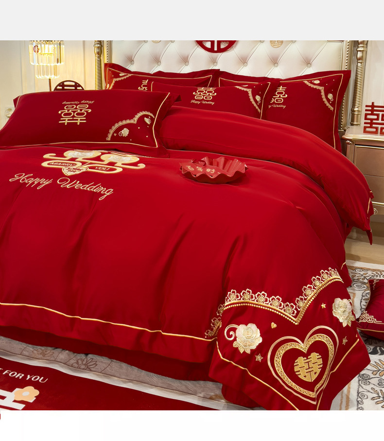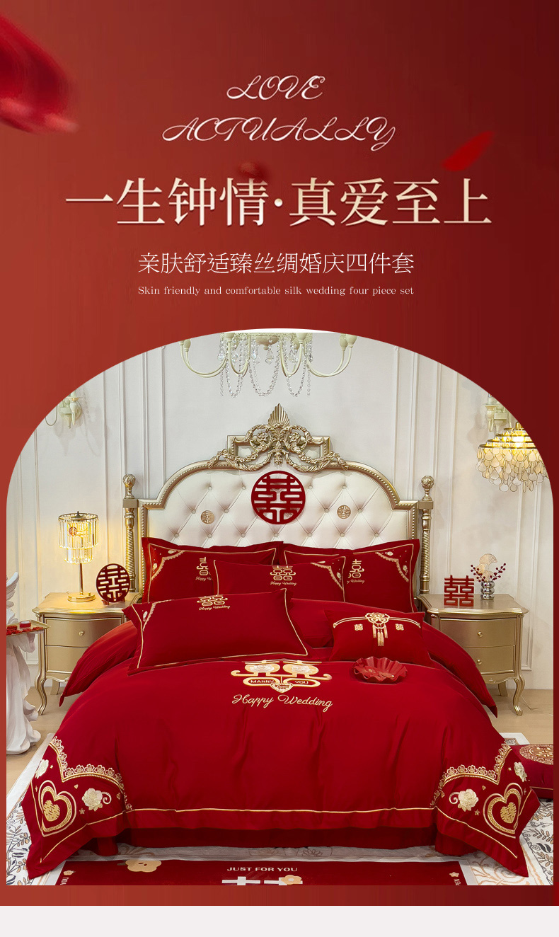 商品名称:菲儿家纺 2023新款绣花亲肤舒适臻丝绸国潮婚庆四件套 喜结良缘
