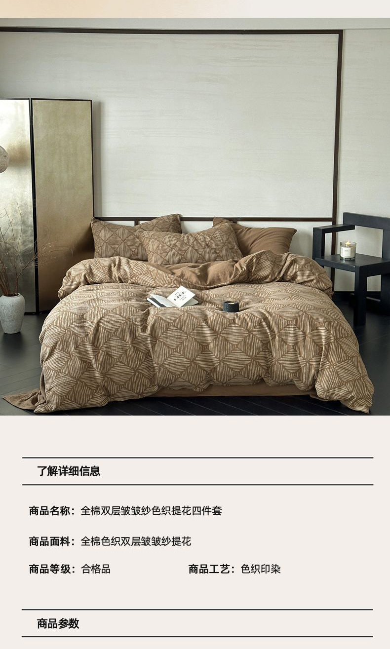 商品名称:山舍家居 2024新款复古双层皱皱纱色织提花四件套 素初