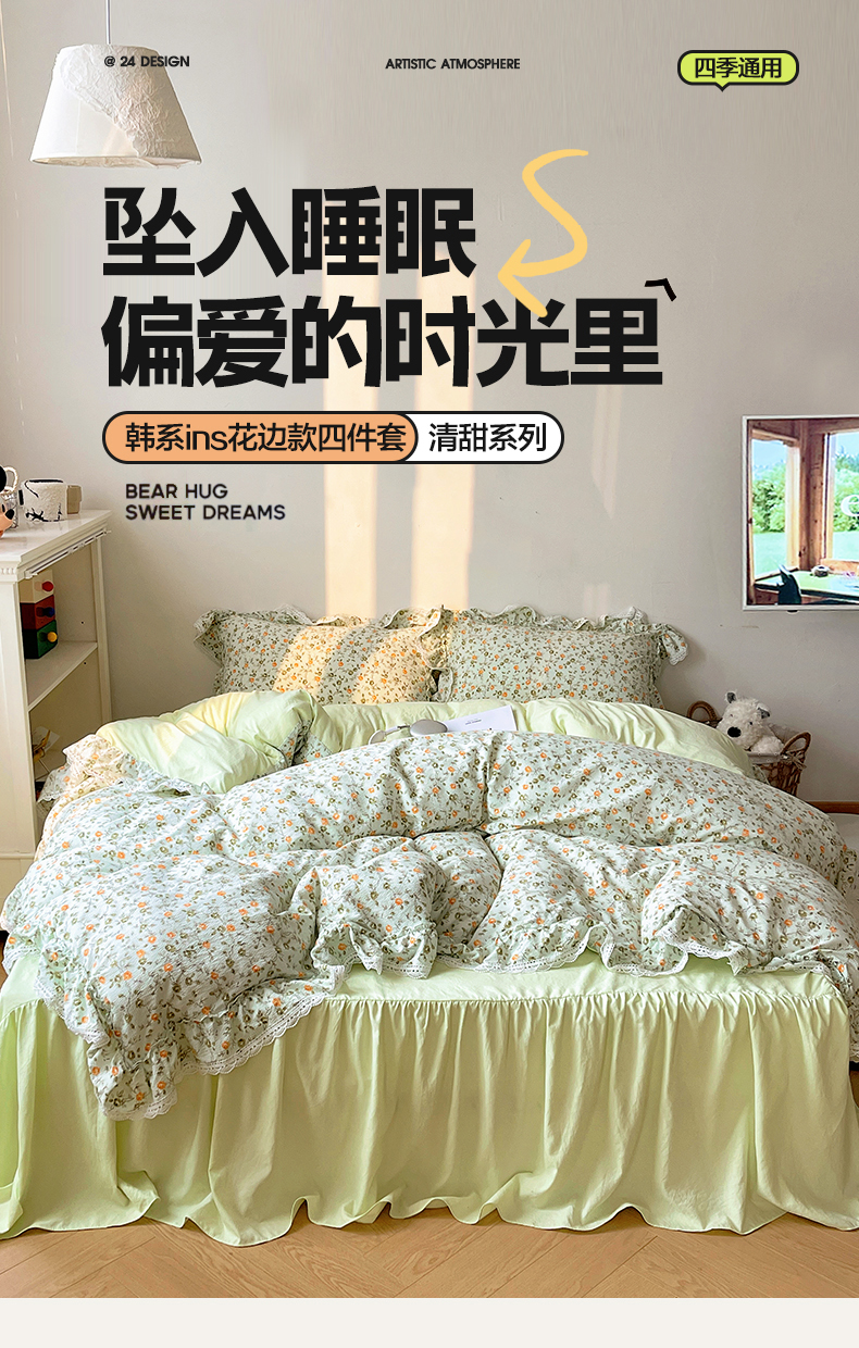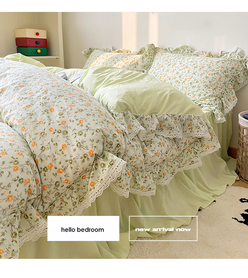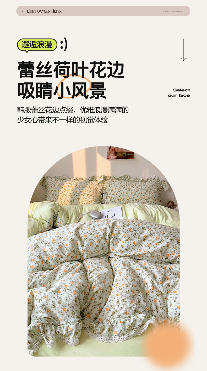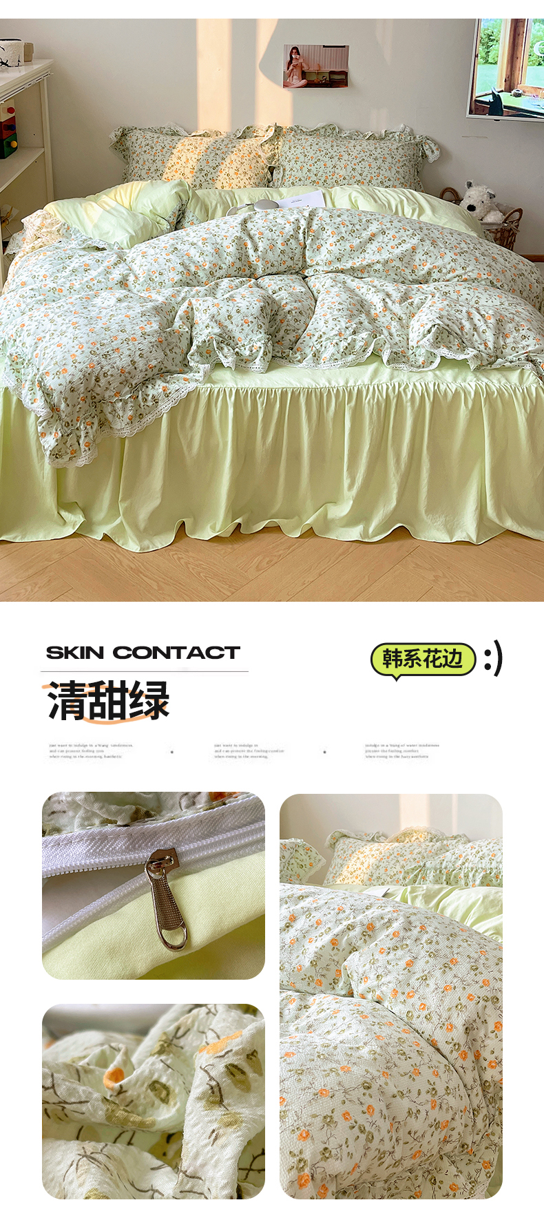 当前位置: 91家纺网 > 商品网购 > 床品套件 > 四件套 > 其它四件套 > 轻奢坊 2024新款韩系ins花边款清甜系列四件套 清甜绿