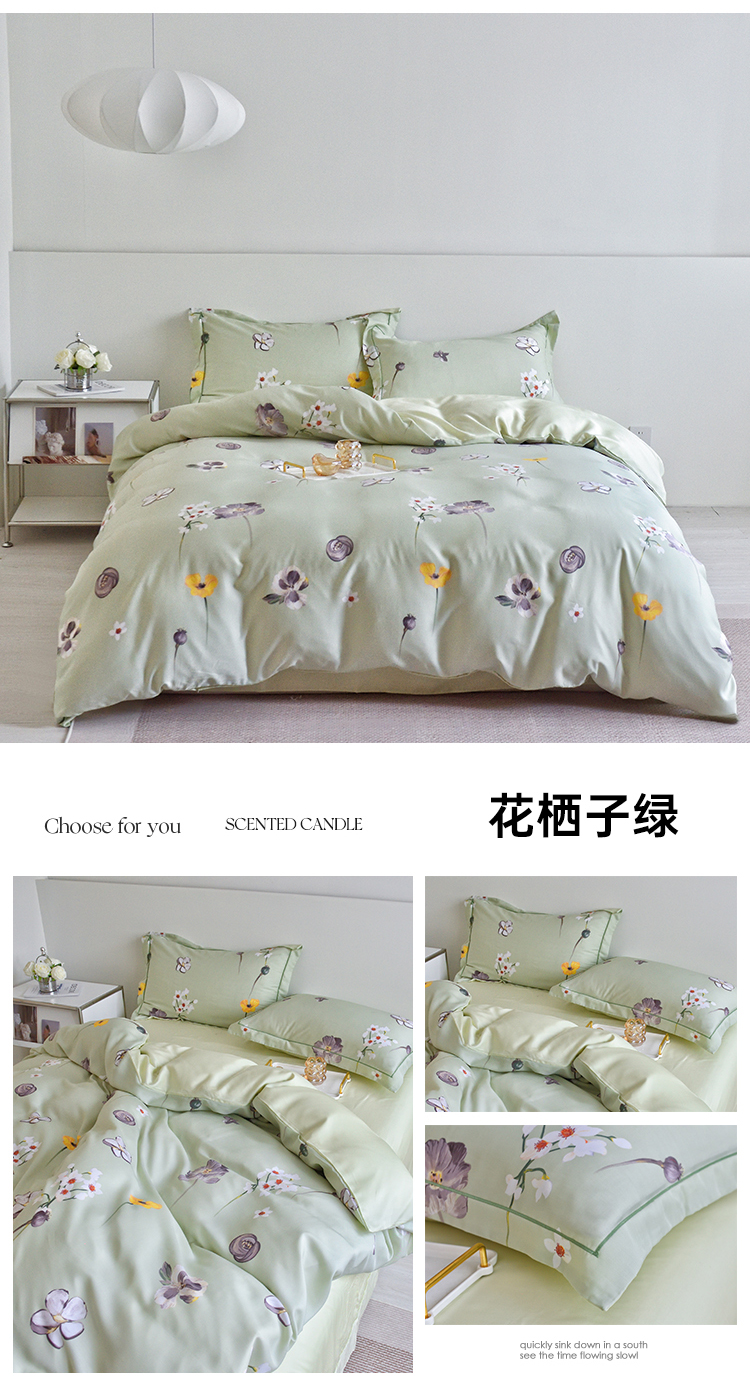 商品名称:氧家 2025新款莱赛尔天丝数码印花四件套宽边断角工艺(礼盒装)花栖子绿