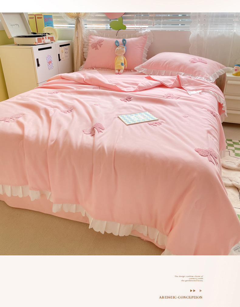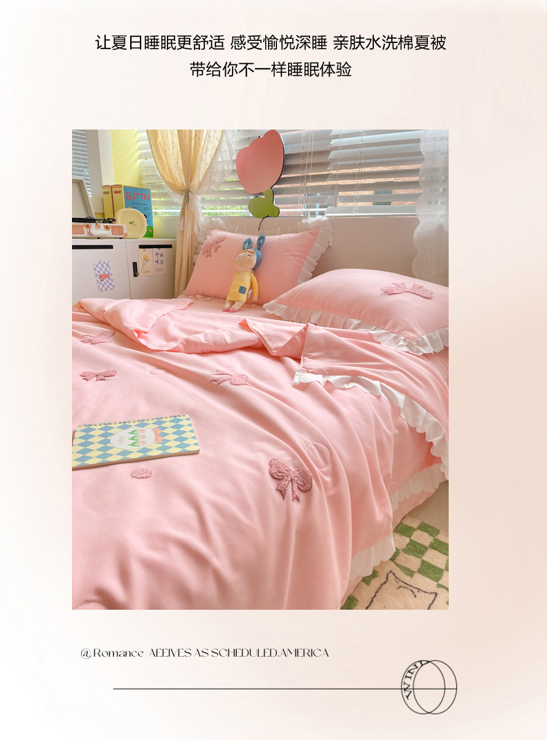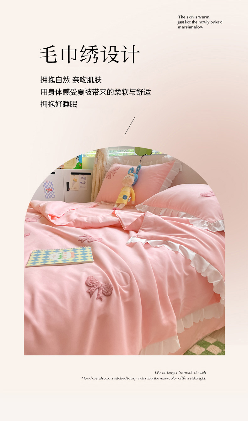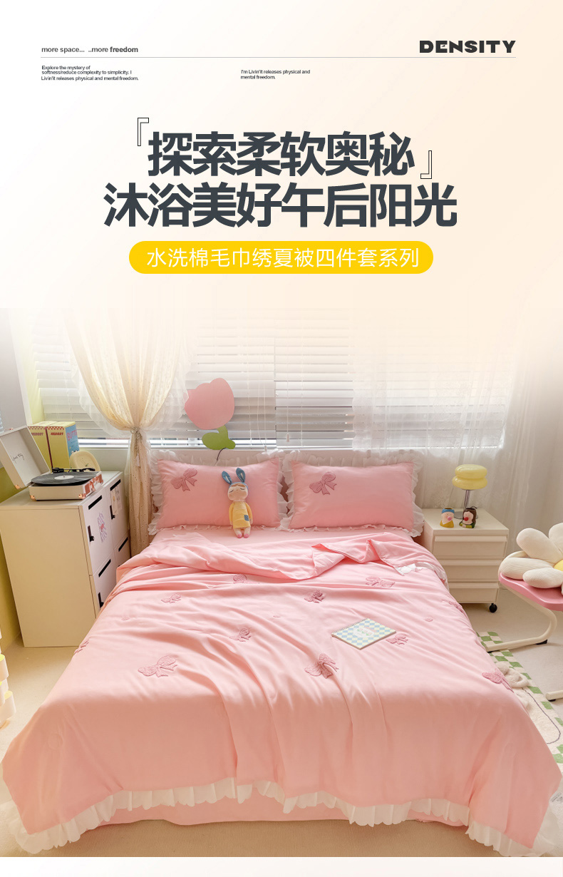 沐慕 2024新款毛巾绣印花夏被四件套 蝴蝶结-粉