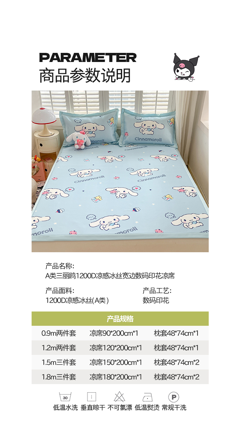 • 91家纺网 家纺一手货源 找家纺 金爱家 2024新款A类三丽鸥授权数码印花中分子1200D凉感冰丝宽边凉感软席 冰丝席-甜心蛋糕玉桂狗