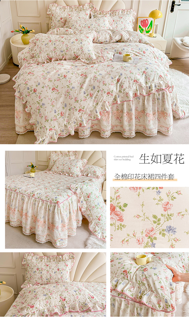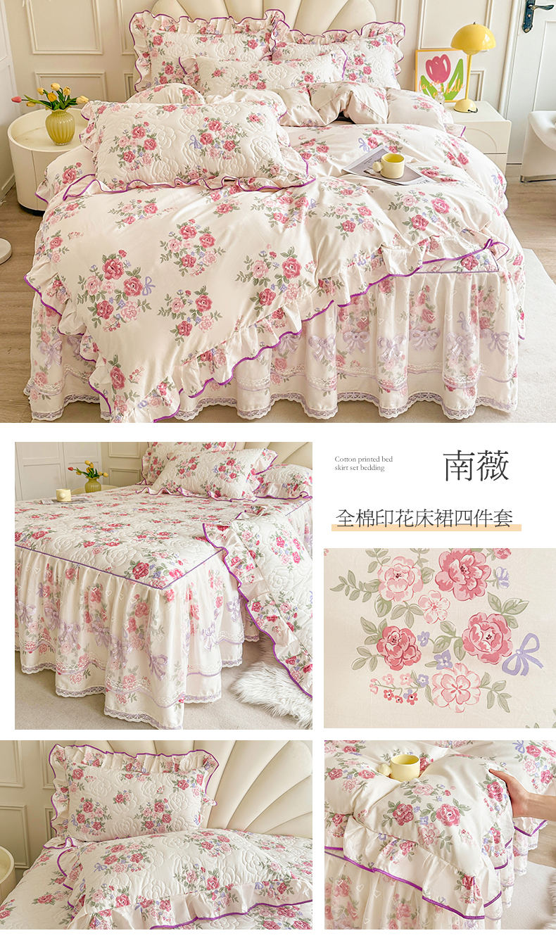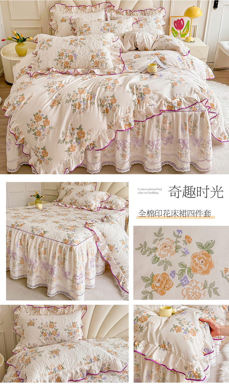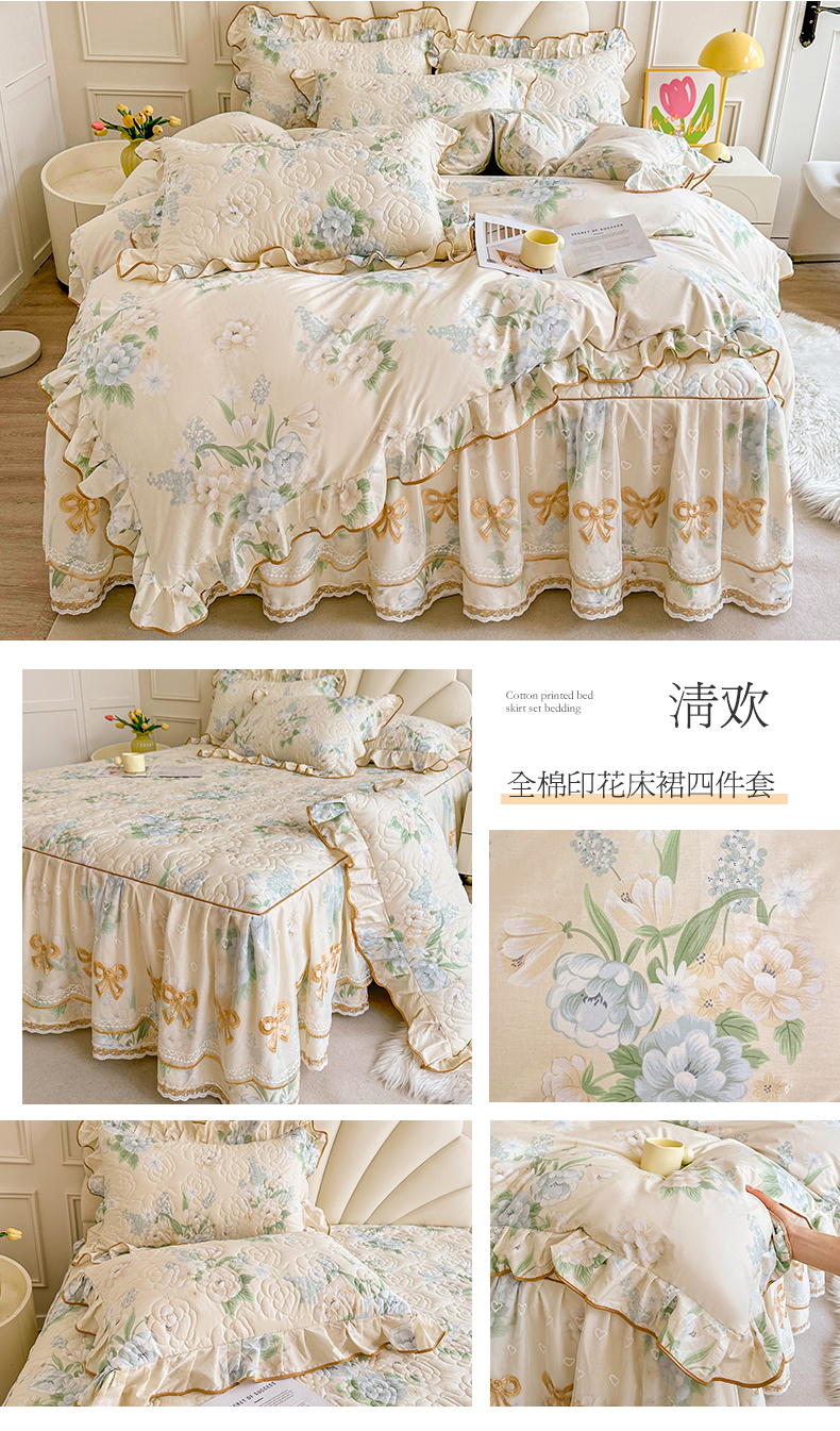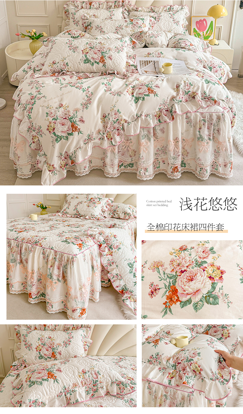 当前位置: 91家纺网 > 商品网购 > 床品套件 > 四件套 > 全棉普通四件套 > 宜凡家纺 2024新款全棉印花公主风夹棉床裙四件套 浅花悠悠