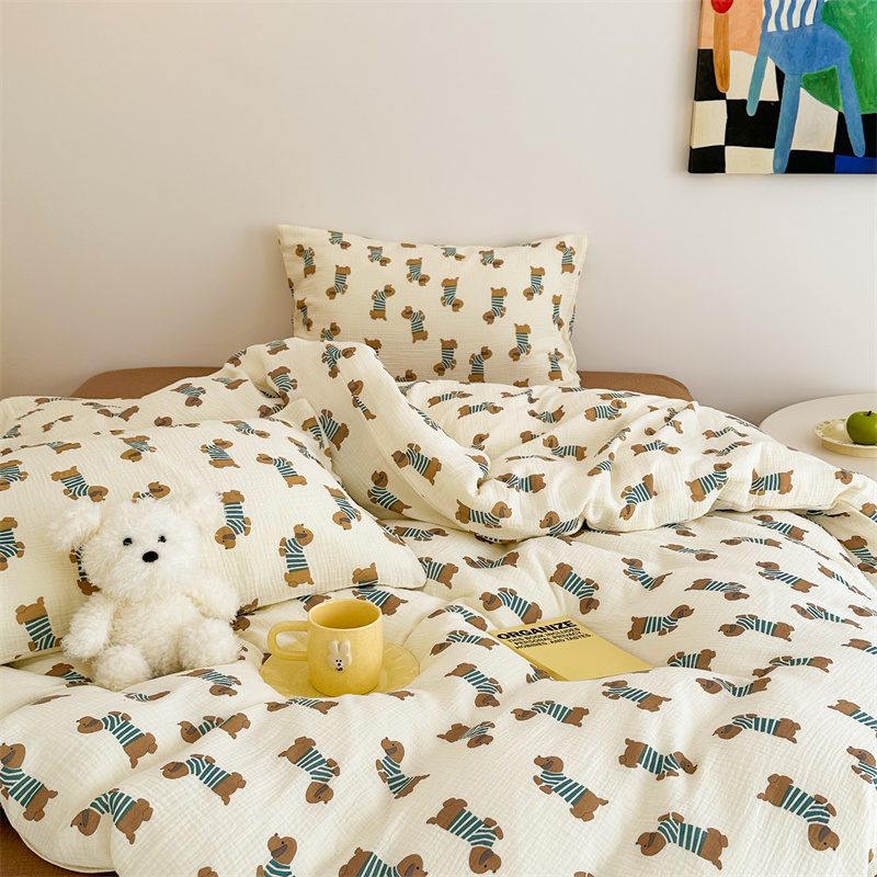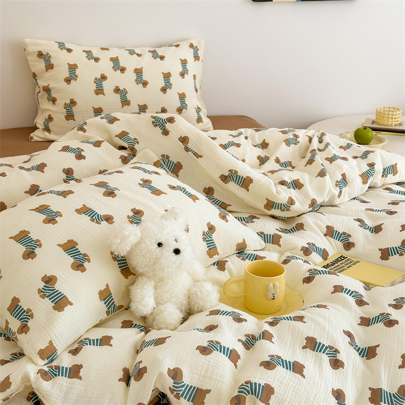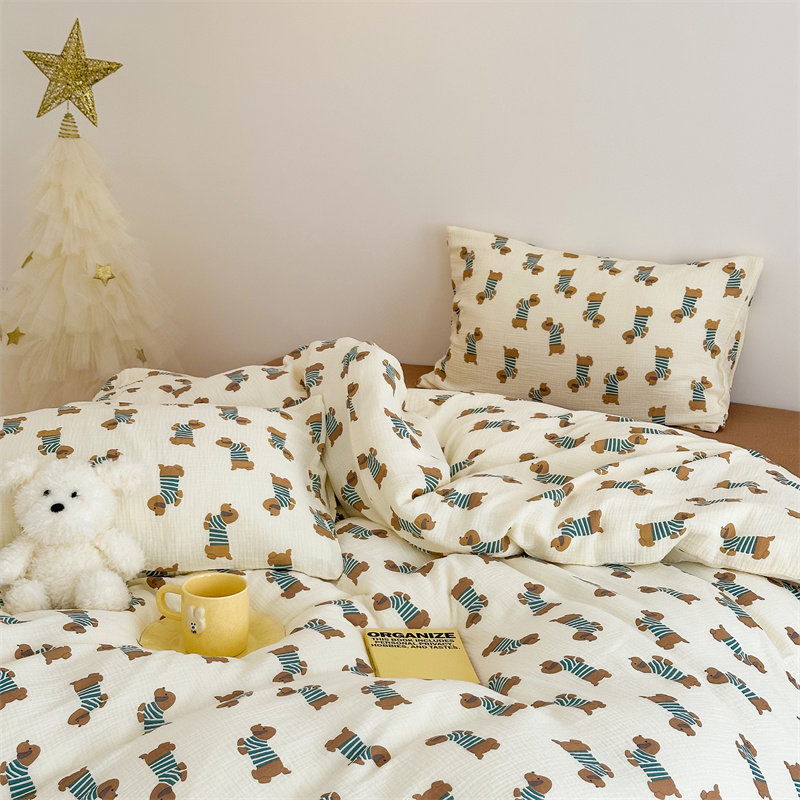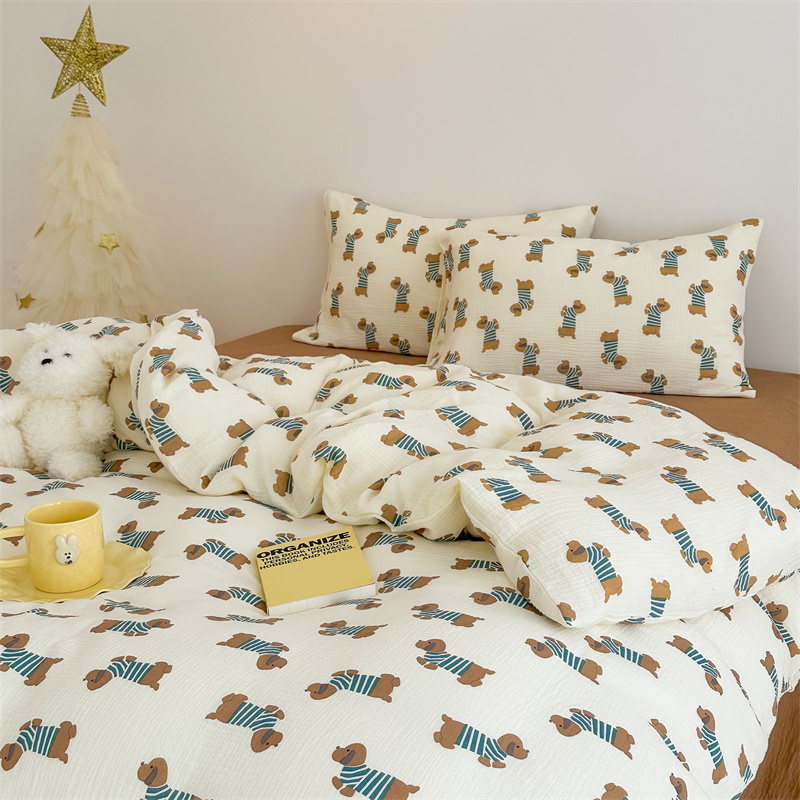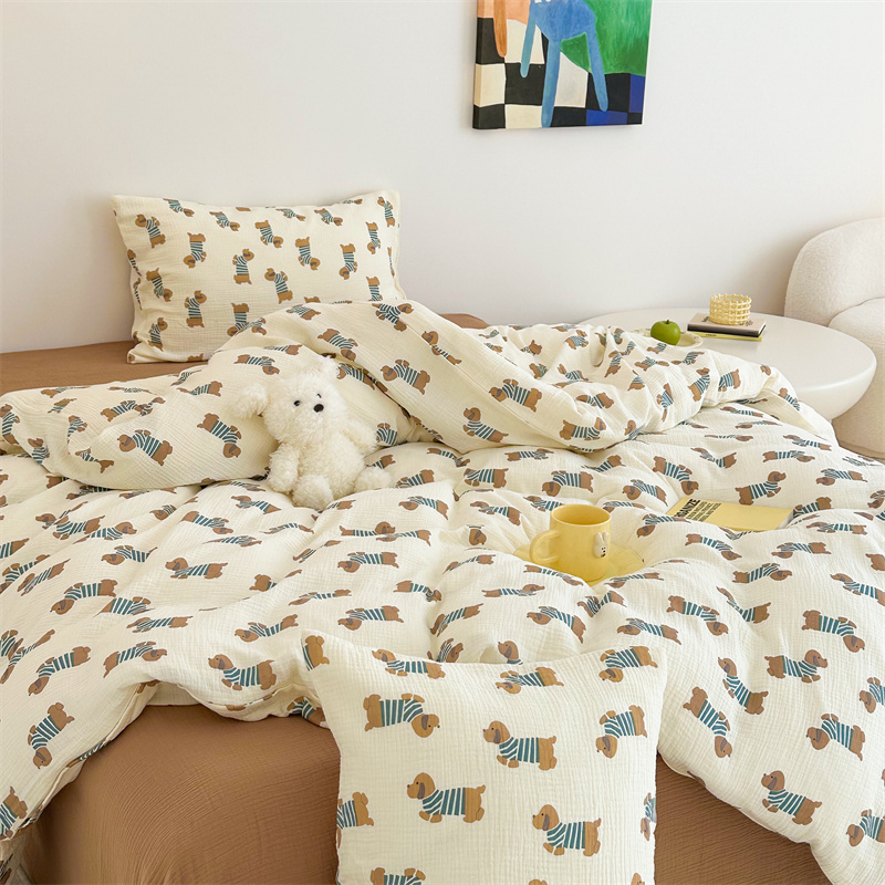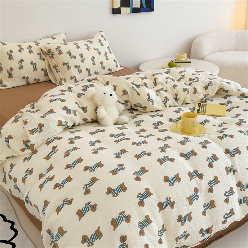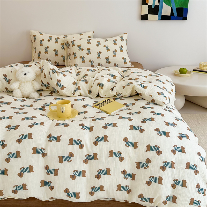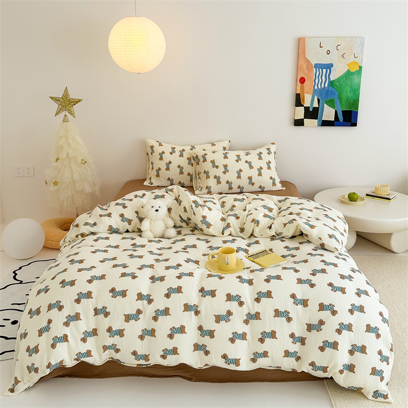 (总)珺柔家纺 2025新款全棉双层纱印花四件套,粉豹纹,焦糖小曲奇,礼物女孩,猫狗日记,奶油星空,线条苹果猫,小飞象,小狗的家,樱桃,樱桃西高地