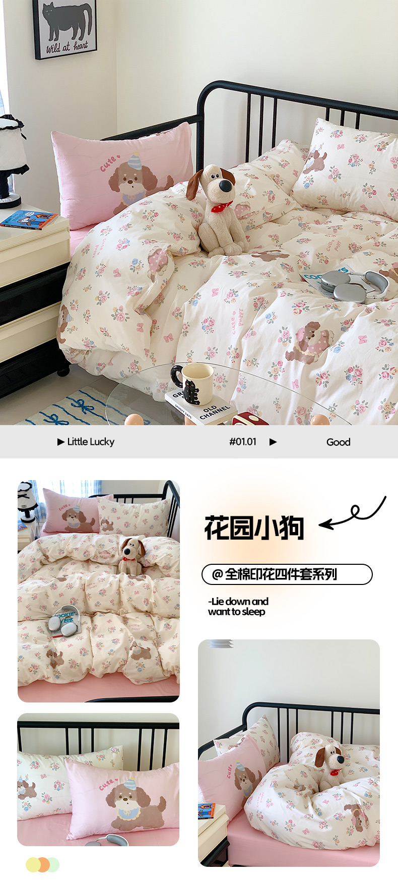 美乐迪家纺 2024新款全棉印花混搭系列四件套 花园小狗
