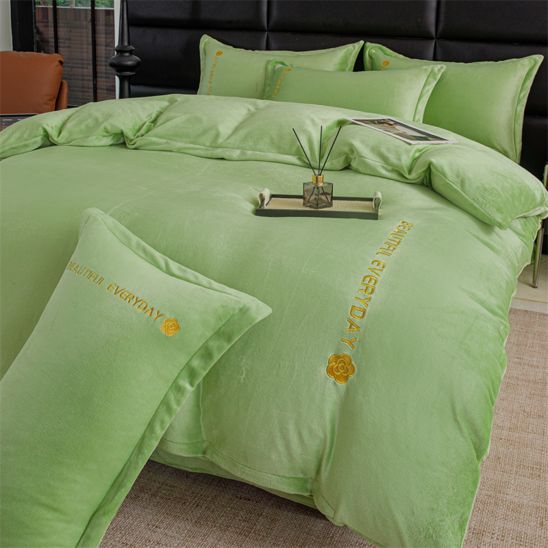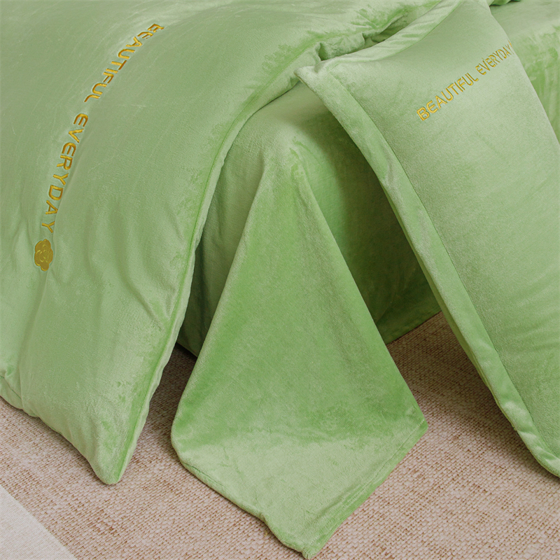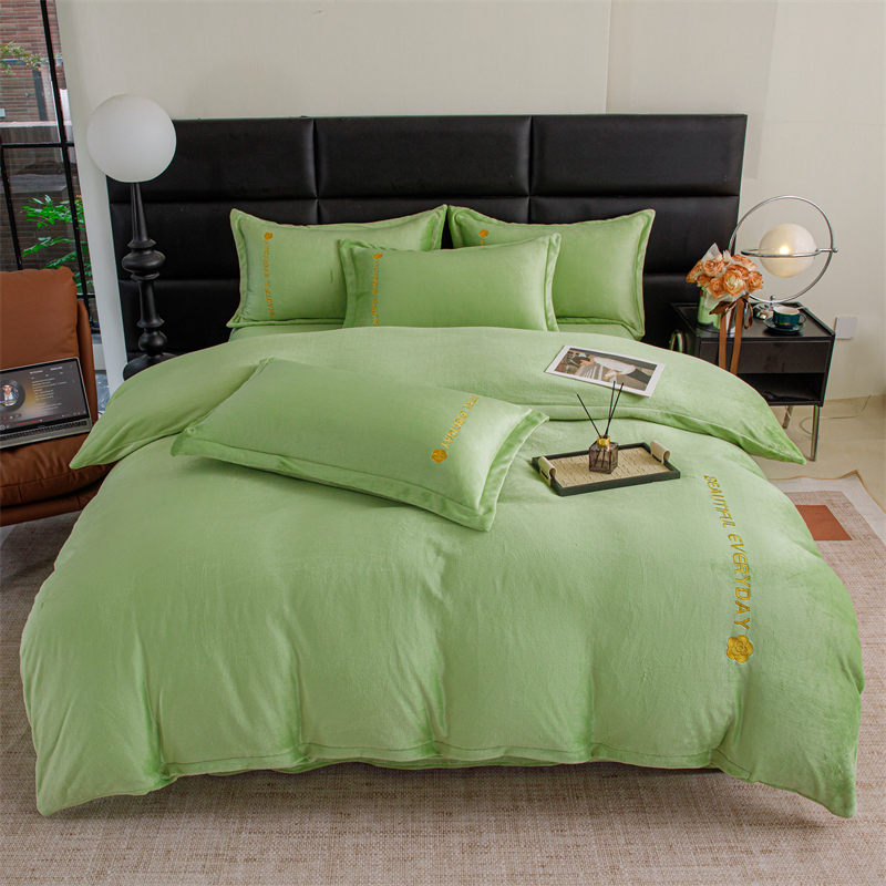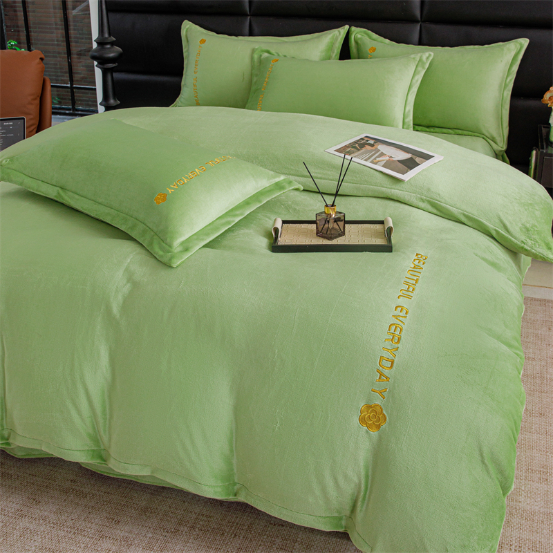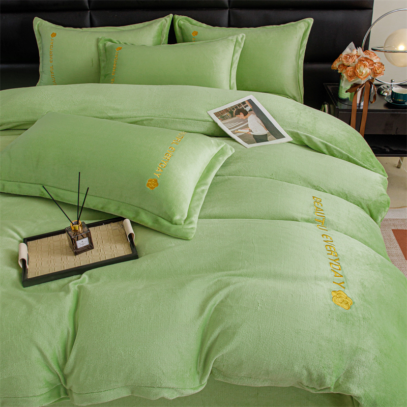 商品名称:神州川 2024直播爆款高克重保暖加厚纯色刺绣牛奶绒四件套- 邂逅-果绿