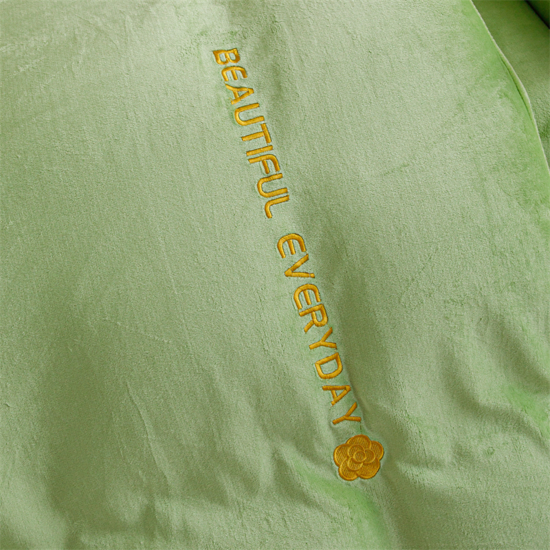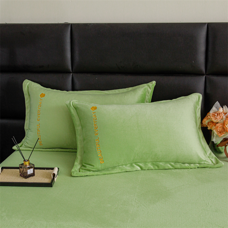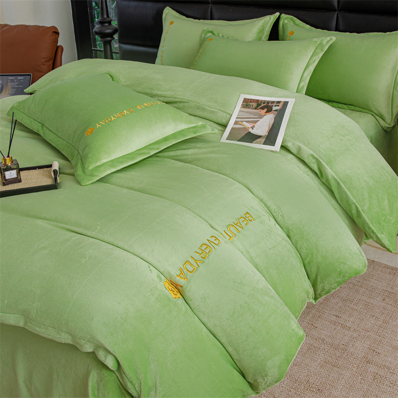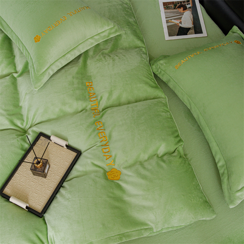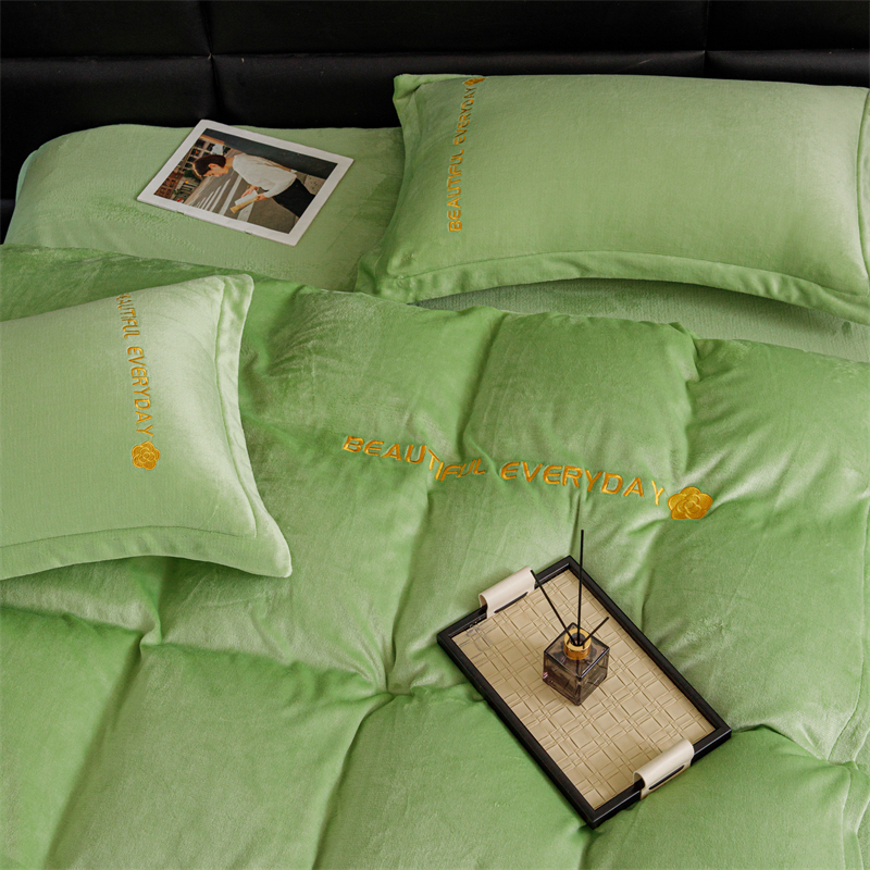 商品名称:神州川 2024直播爆款高克重保暖加厚纯色刺绣牛奶绒四件套- 邂逅-果绿