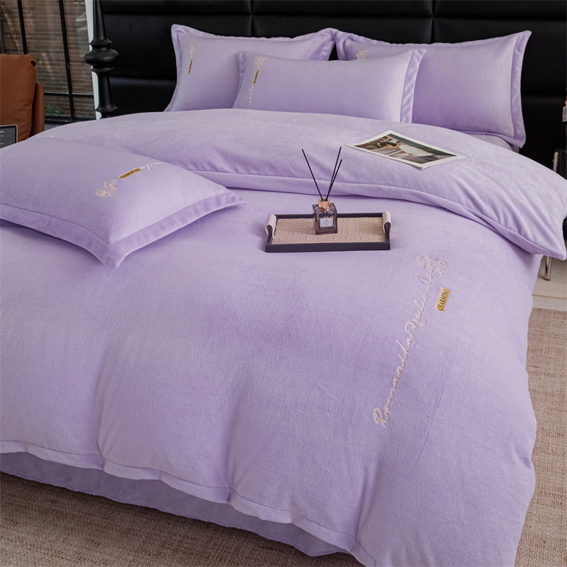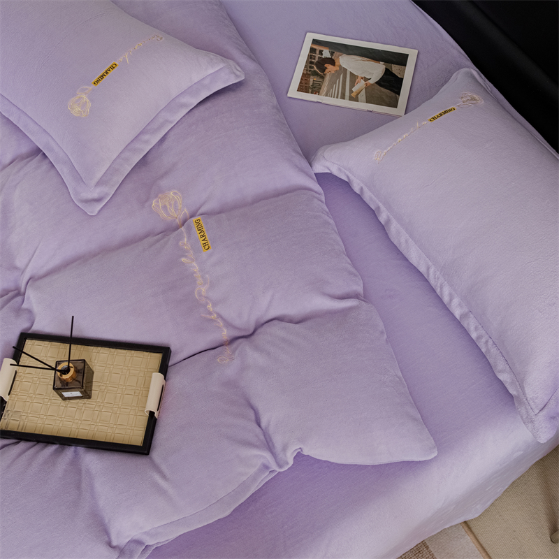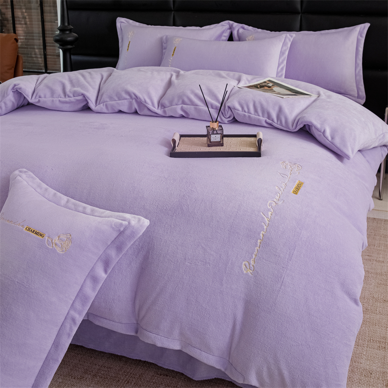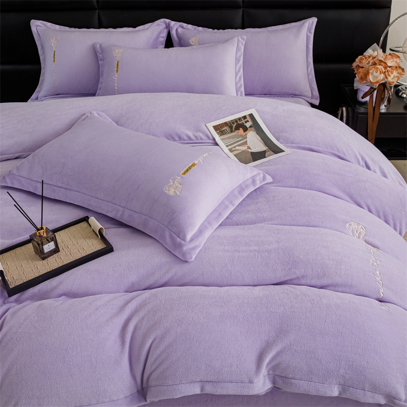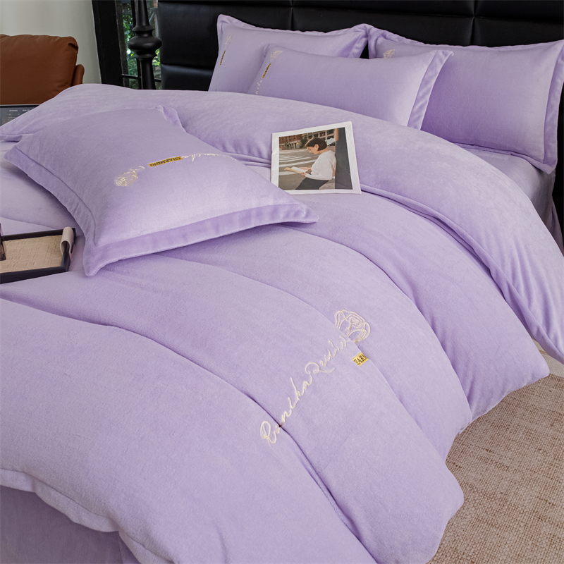 商品名称:神州川 2024直播爆款高克重保暖加厚纯色刺绣牛奶绒四件套-遇见-紫色