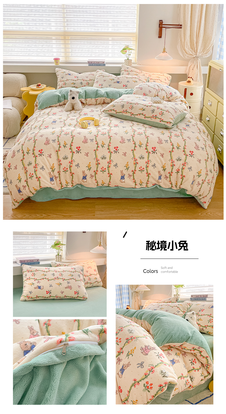 商品名称:雅居纺家纺 2024新款高克重印花牛奶绒四件套 秘境小兔