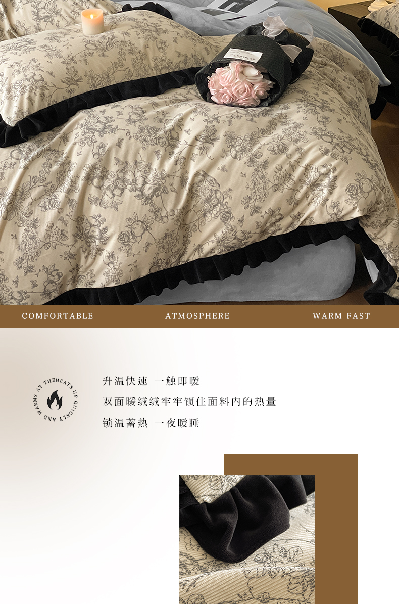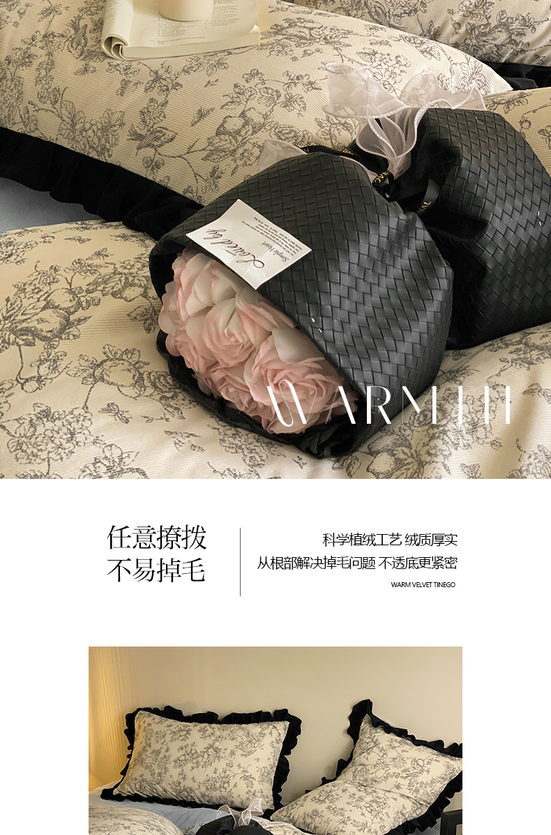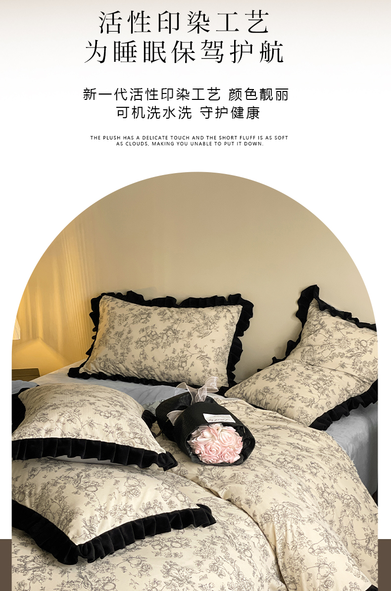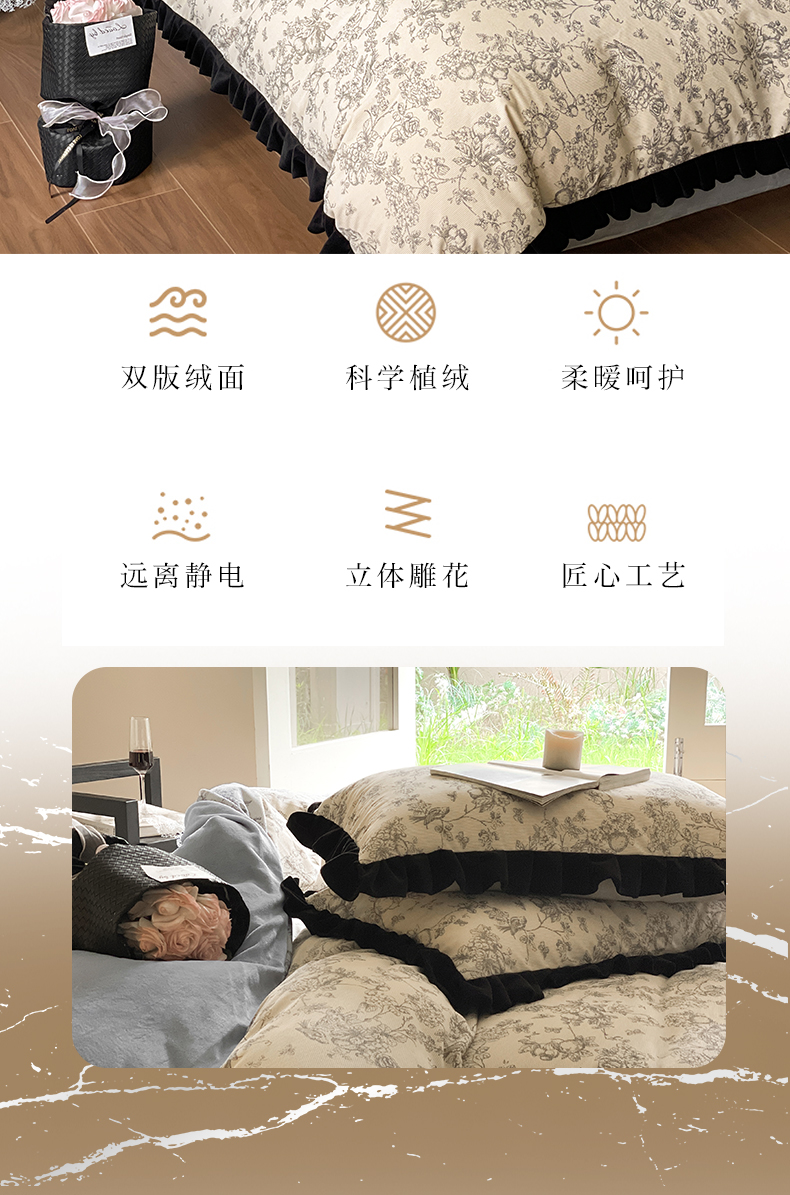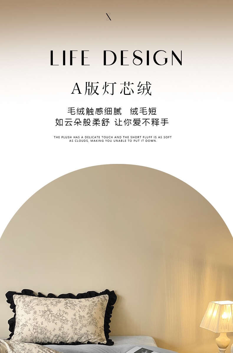 羚羊语家纺 2024新款轻法式赫本风灯芯绒四件套提花立体韩版花边牛奶绒三件套 初禾