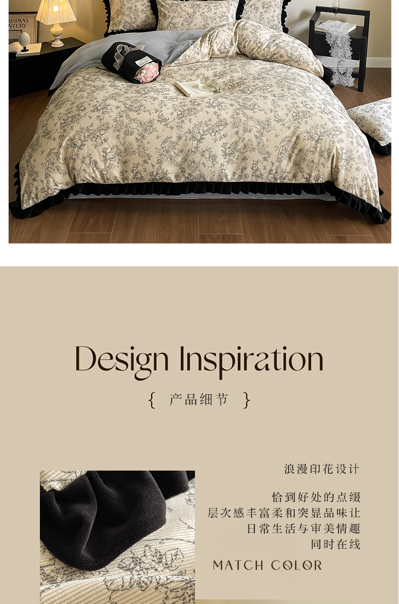 商品名称:羚羊语家纺 2024新款轻法式赫本风灯芯绒四件套提花立体韩版花边牛奶绒三件套 初禾