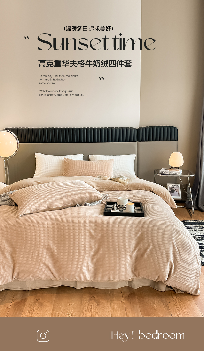 商品名称:雅居纺家纺 2024新款简约风雕花绒四件套 华夫格绒-奶咖