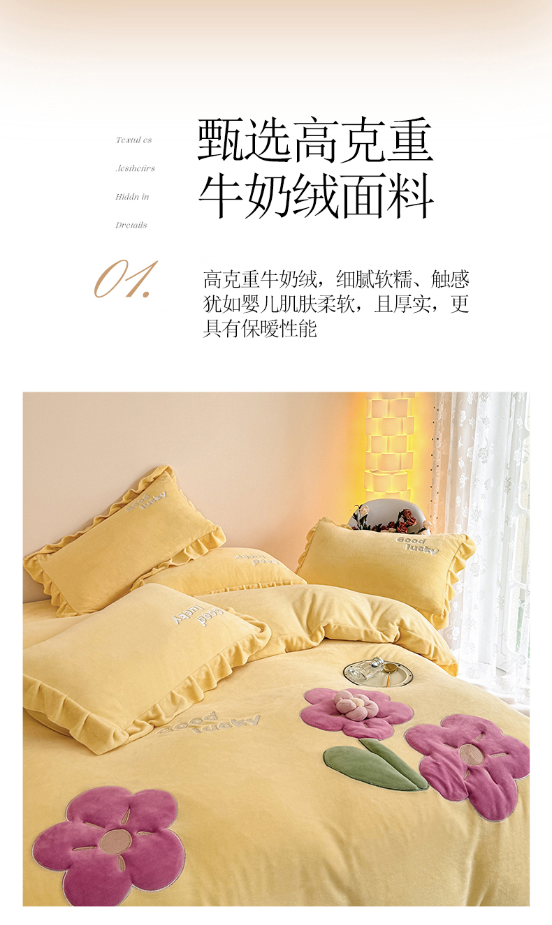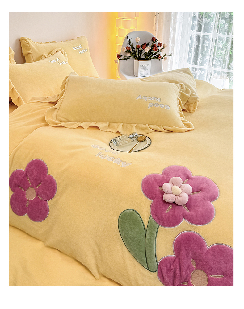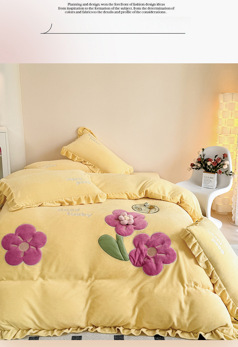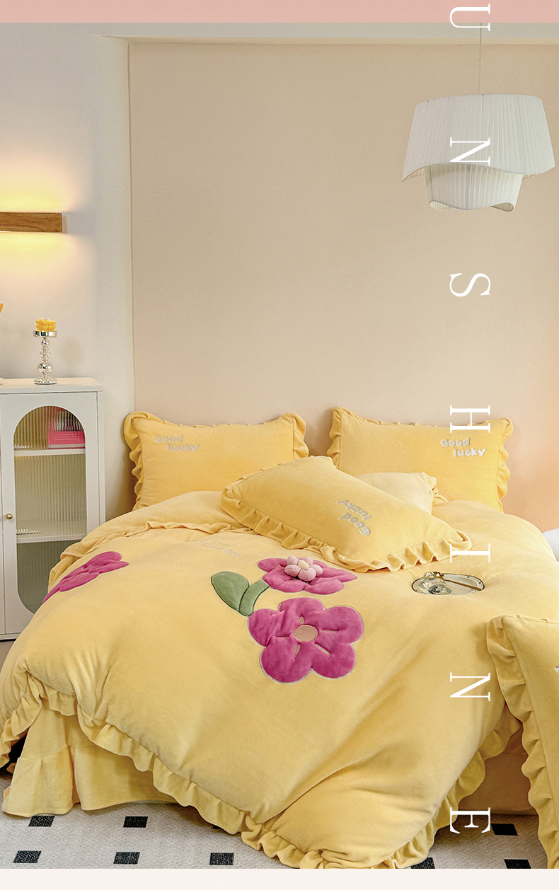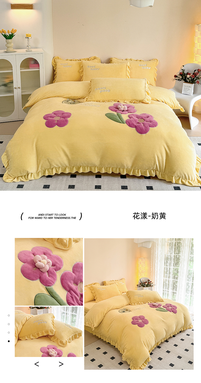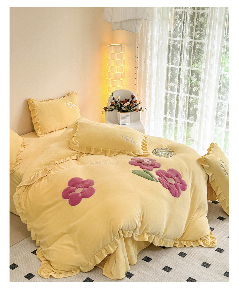 云锦家居 2024秋冬新品(花漾)牛奶绒荷叶边贴布四件套 花漾-奶黄