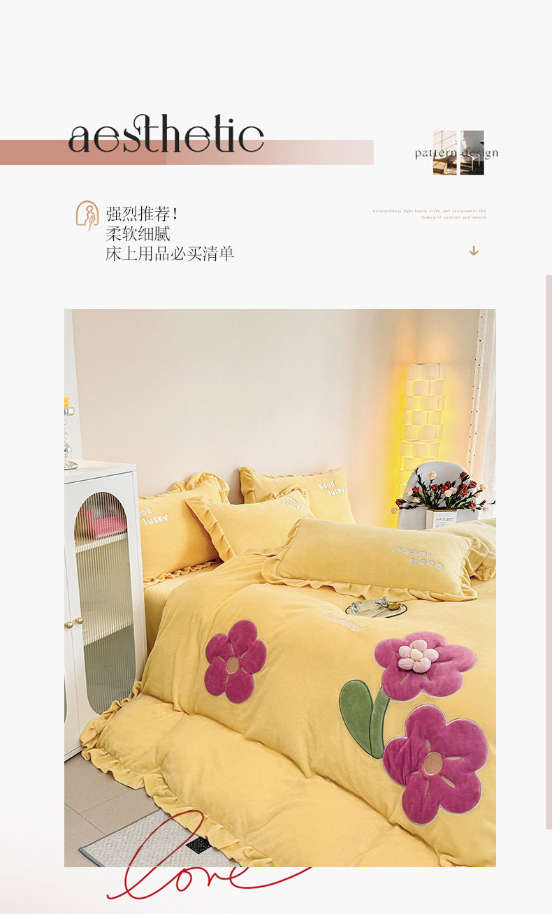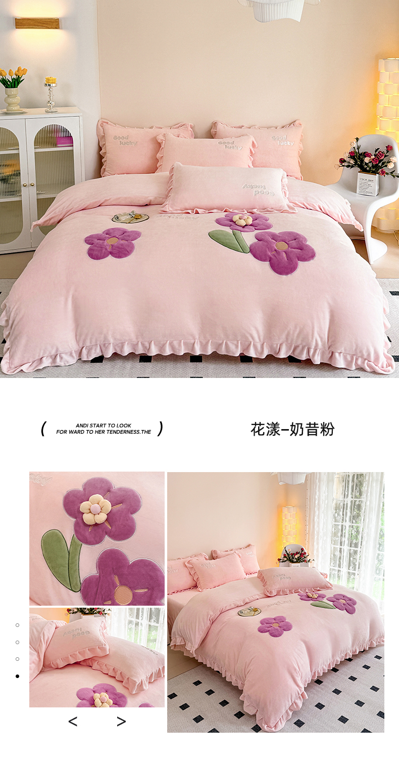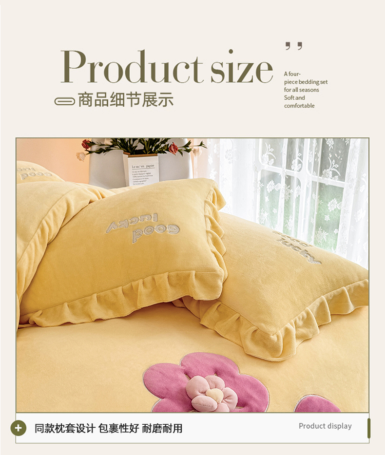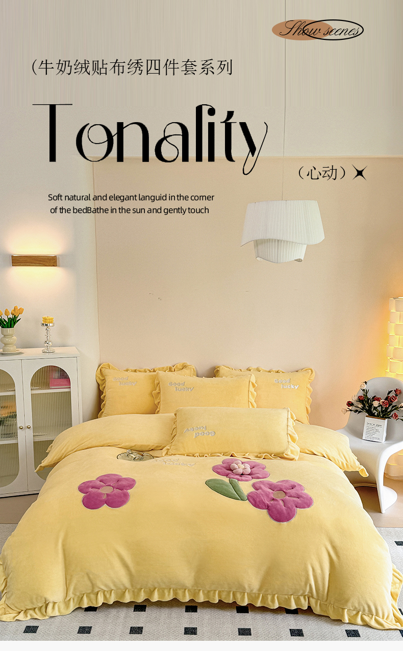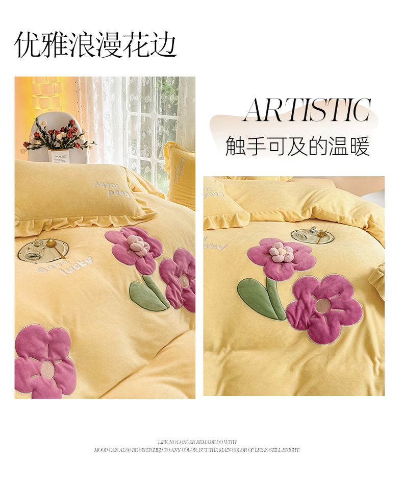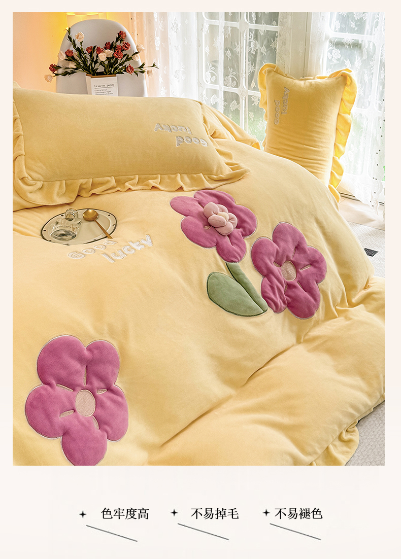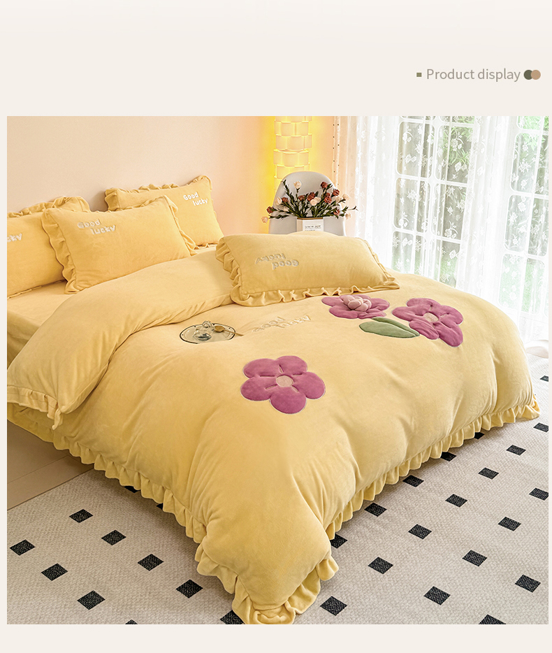 云锦家居 2024秋冬新品(花漾)牛奶绒荷叶边贴布四件套 花漾-奶黄