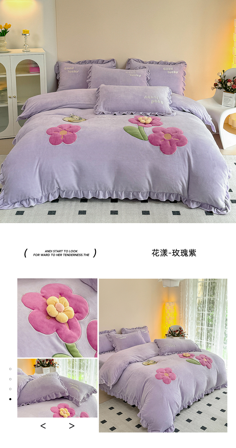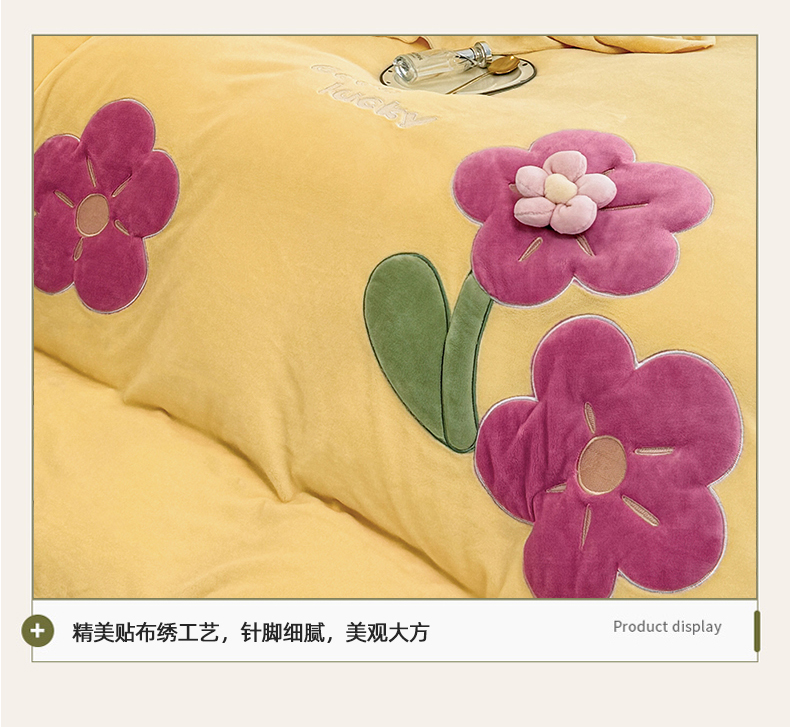 商品名称:云锦家居 2024秋冬新品(花漾)牛奶绒荷叶边贴布四件套 花漾-奶黄