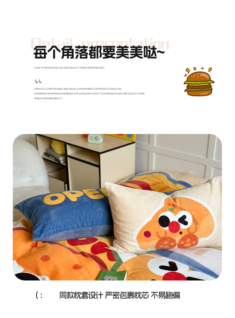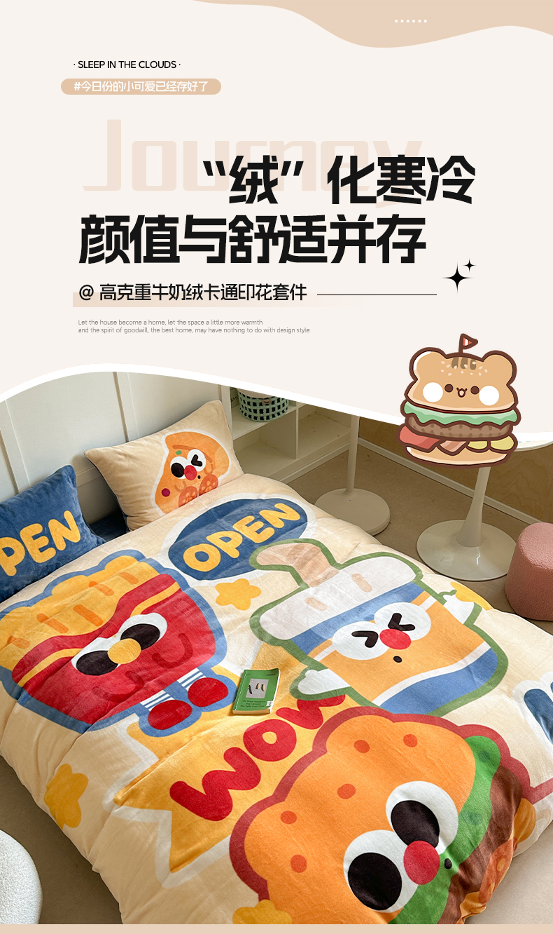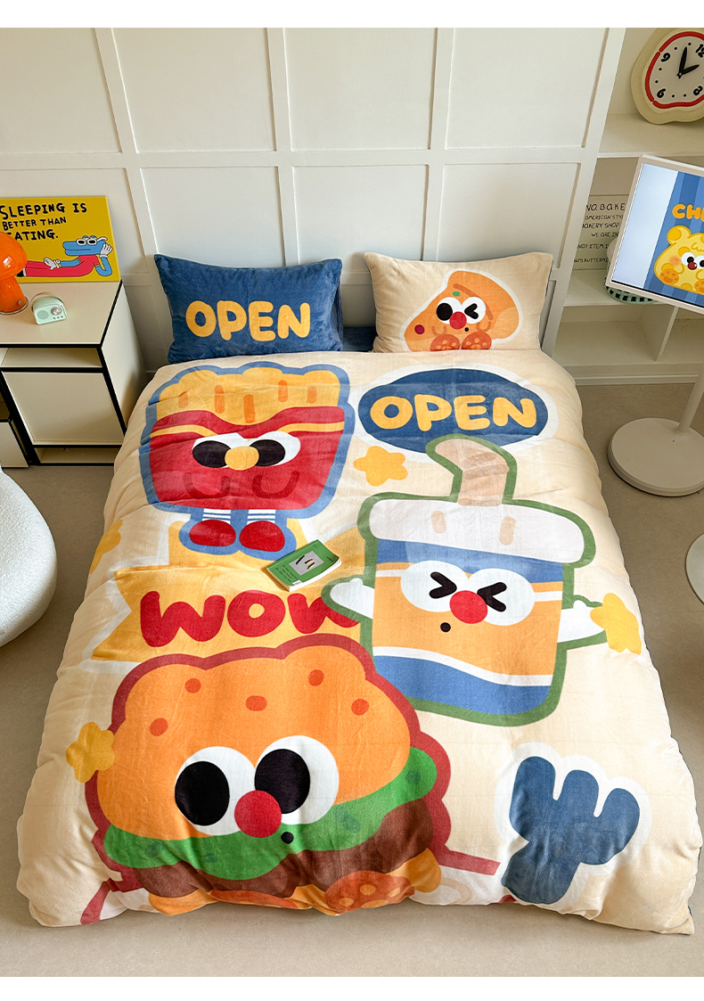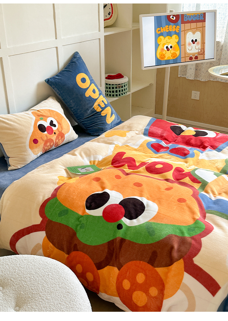 美乐迪家纺 2024新款高克重牛奶绒卡通印花四件套 汉堡