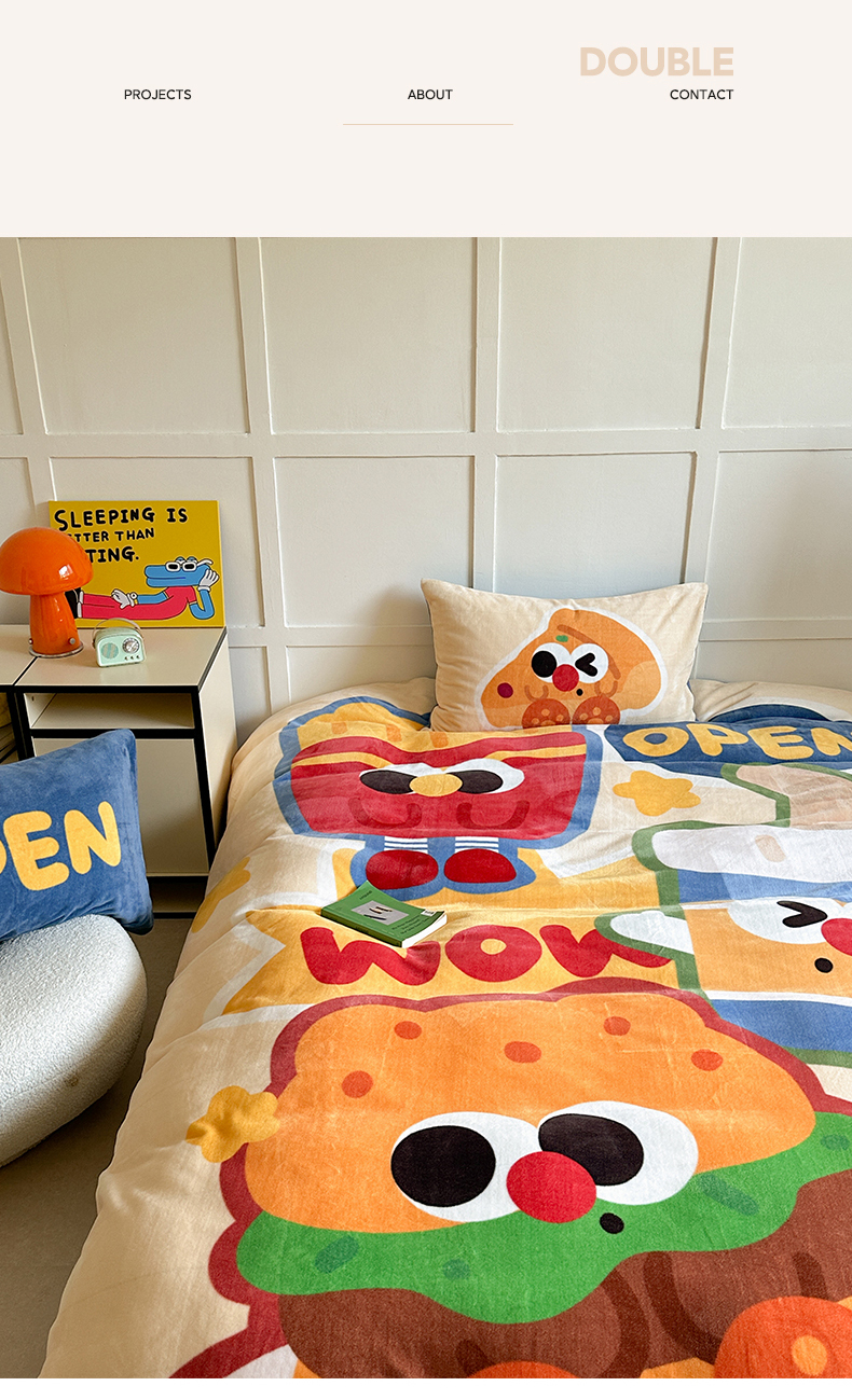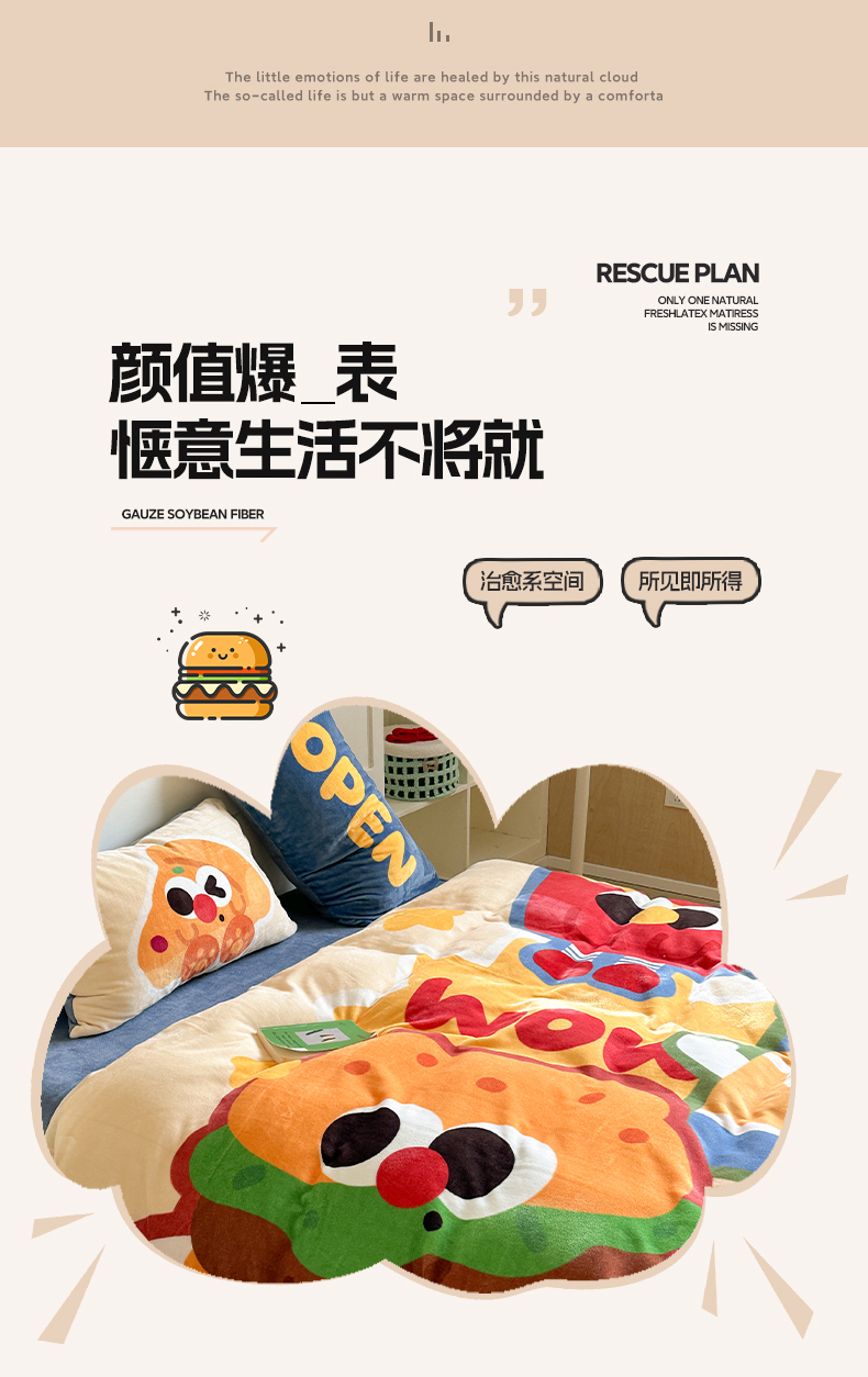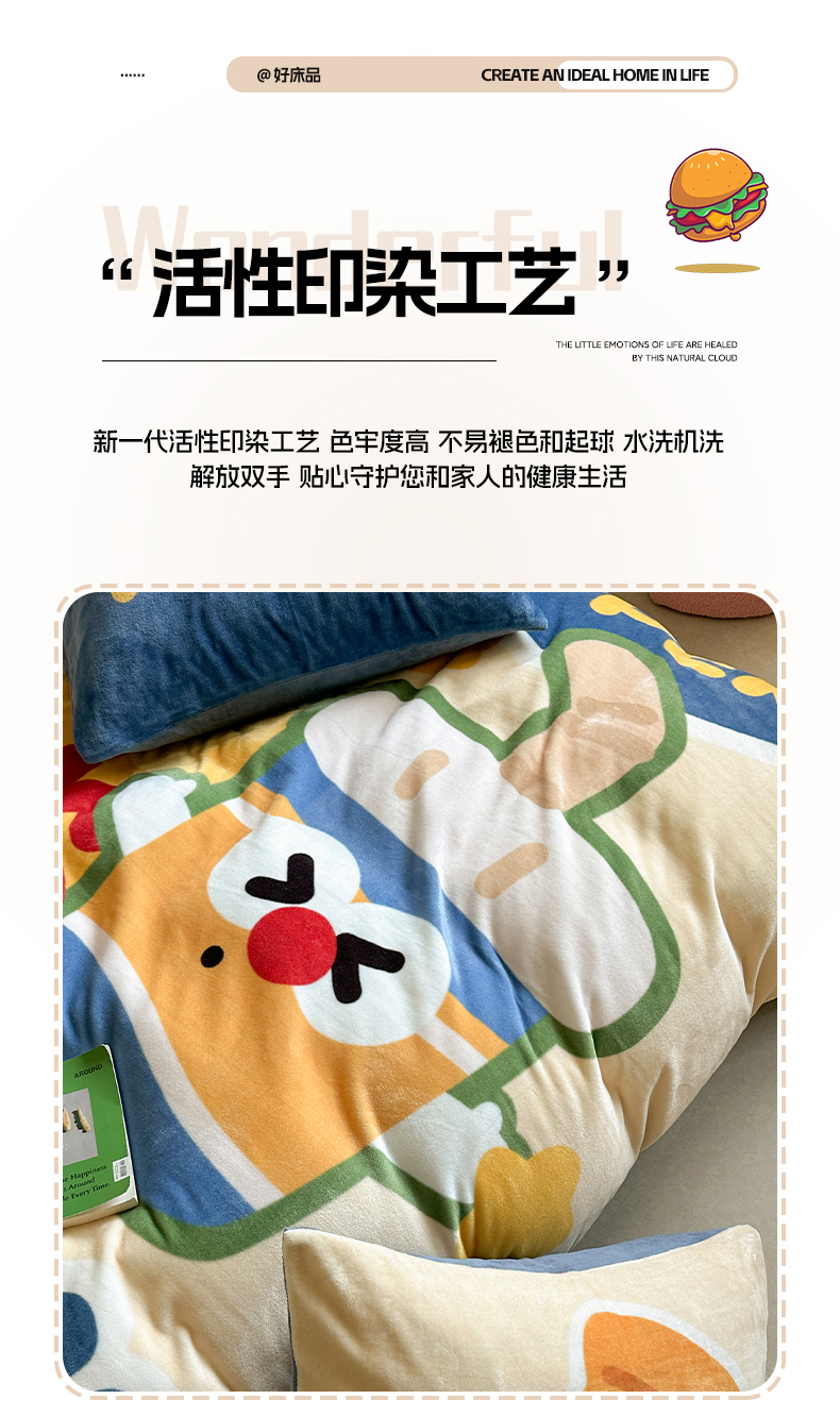 美乐迪家纺 2024新款高克重牛奶绒卡通印花四件套 汉堡