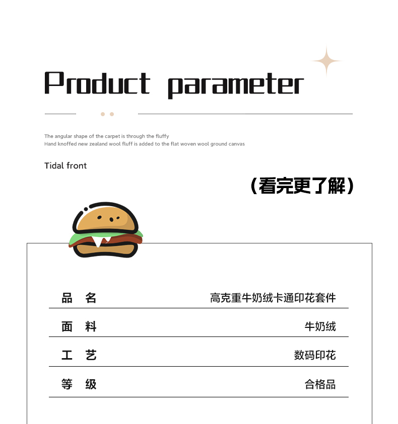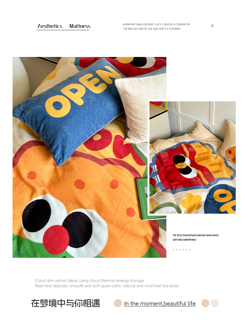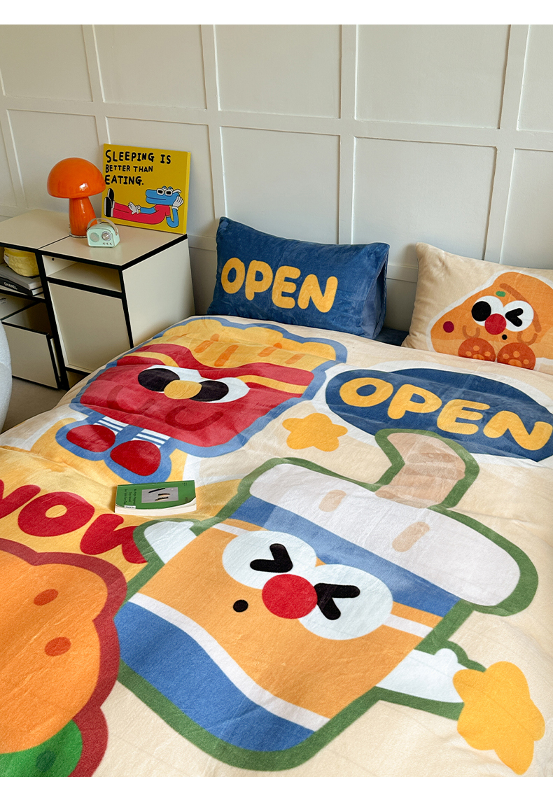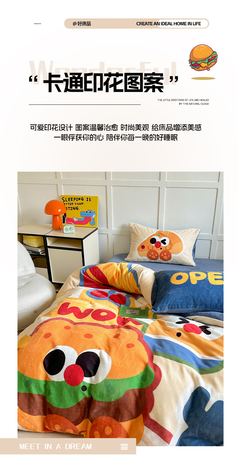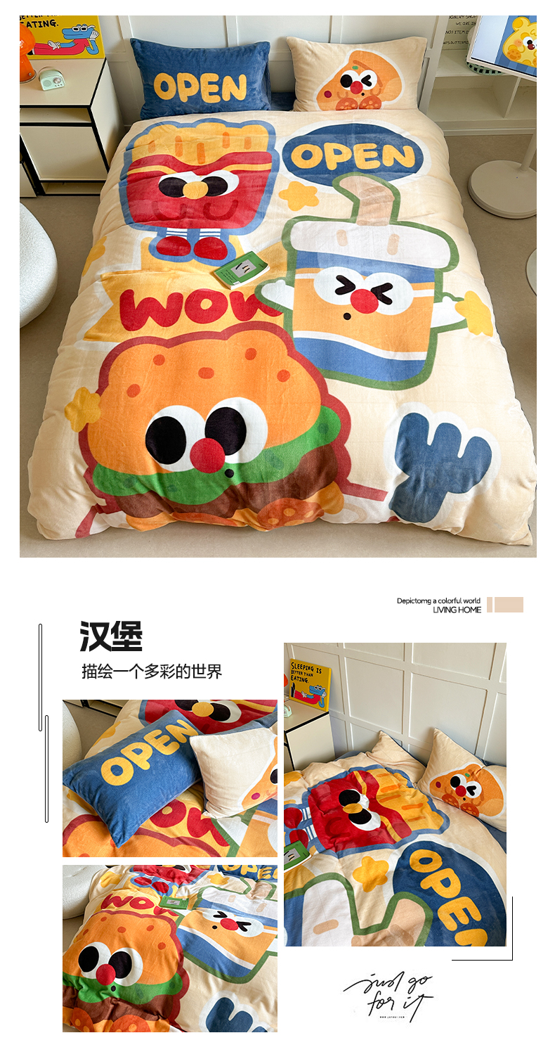 商品名称:美乐迪家纺 2024新款高克重牛奶绒卡通印花四件套 汉堡