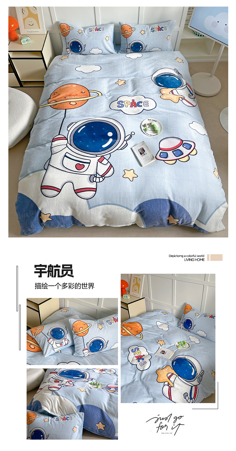 美乐迪家纺 2024新款高克重牛奶绒卡通印花四件套 宇航员