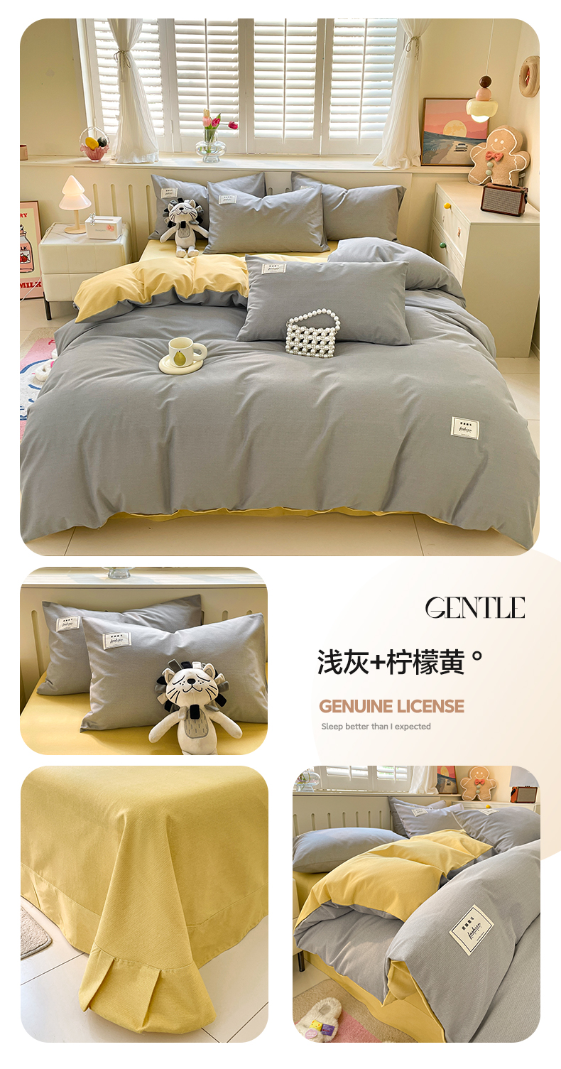 当前位置: 91家纺网 > 商品网购 > 床品套件 > 四件套 > 普通磨毛四件套 > 韩后家纺 2025新款原棉磨毛加厚双拼四件套 浅灰+柠檬黄
