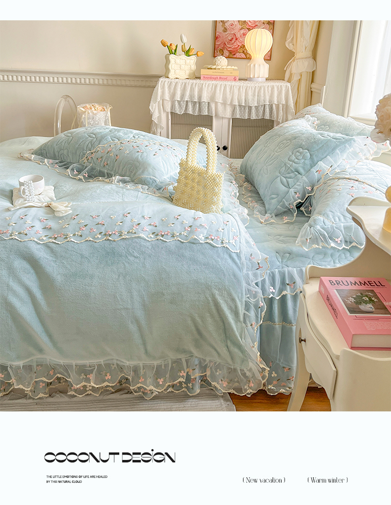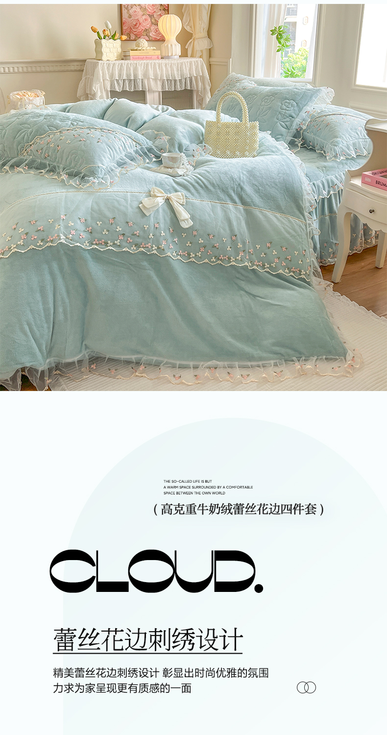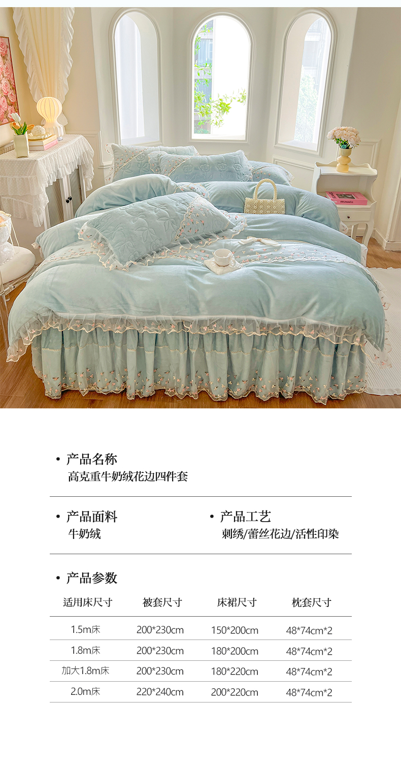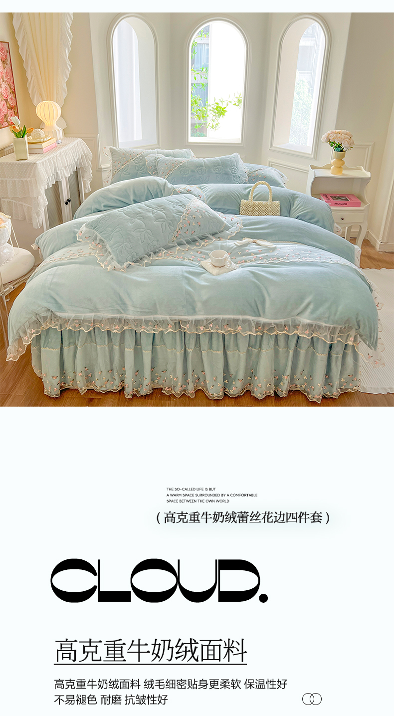 当前位置: 91家纺网 > 商品网购 > 床品套件 > 四件套 > 牛奶绒四件套 > 网红馆(ck家纺) 2025新款加厚保暖高克重牛奶绒蕾丝花边床裙款恬星系列四件套 恬星-云水蓝