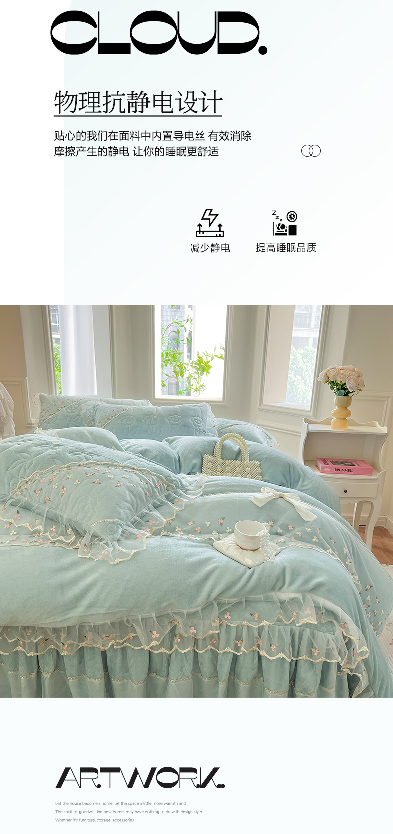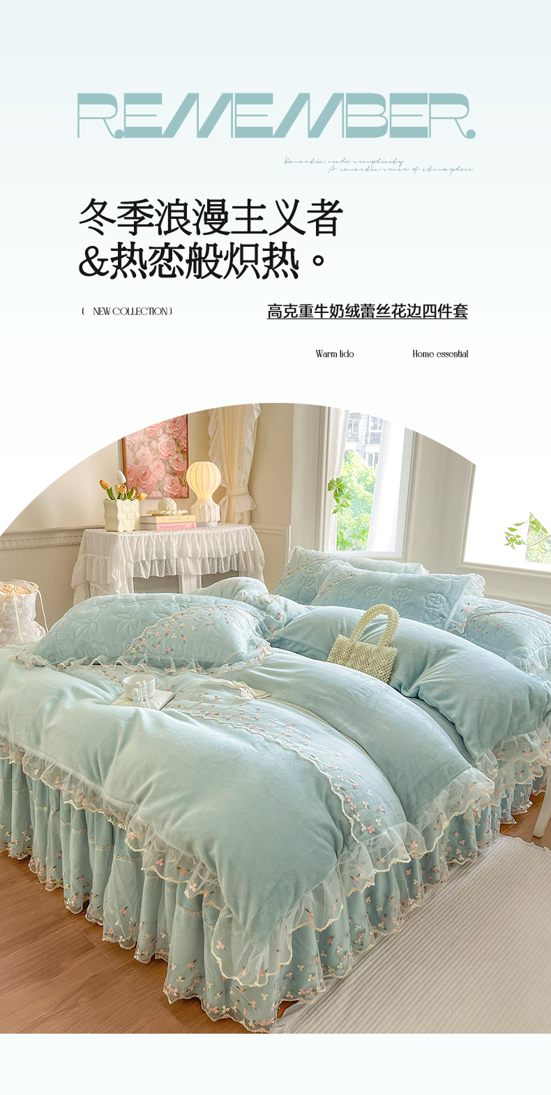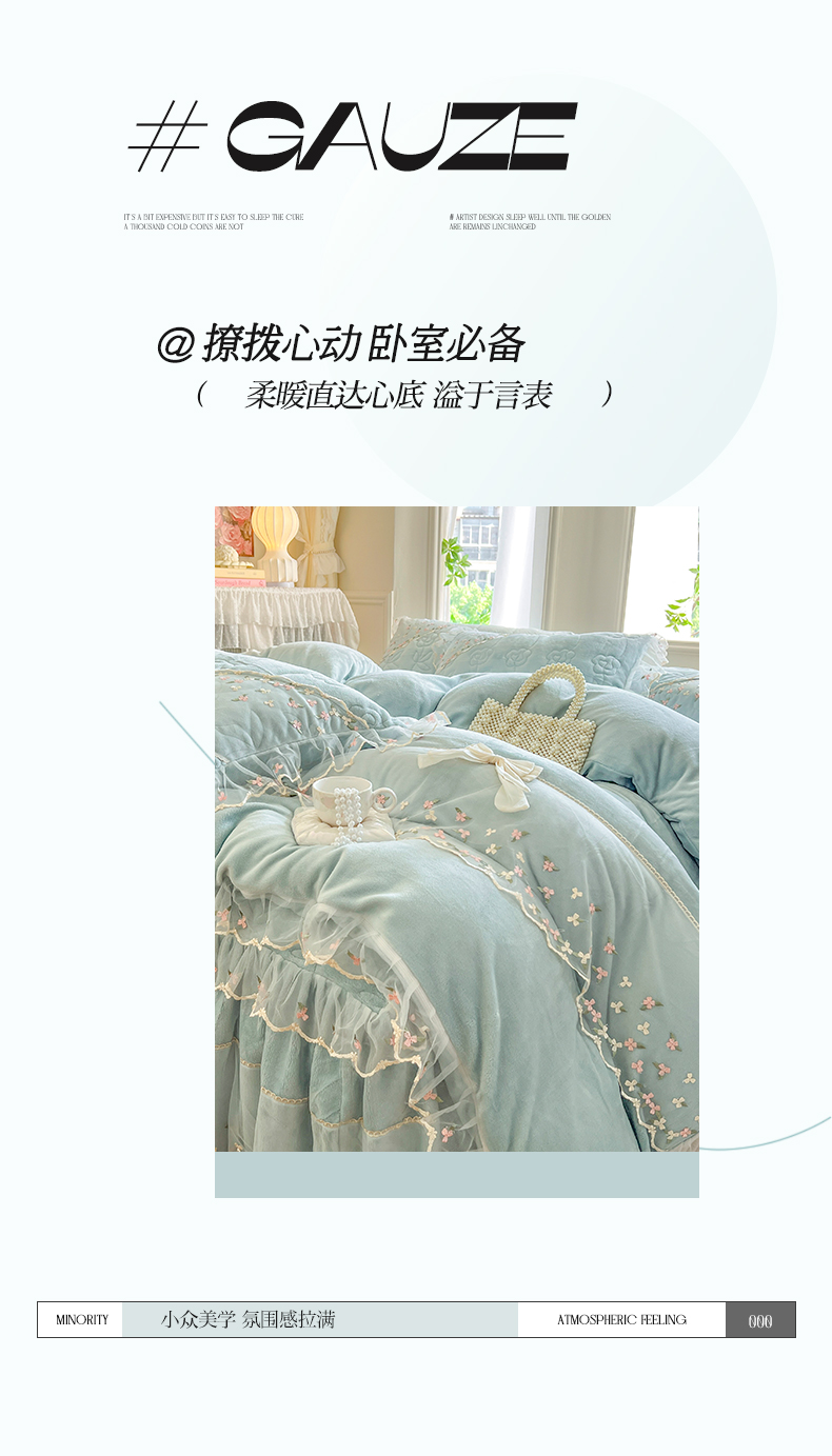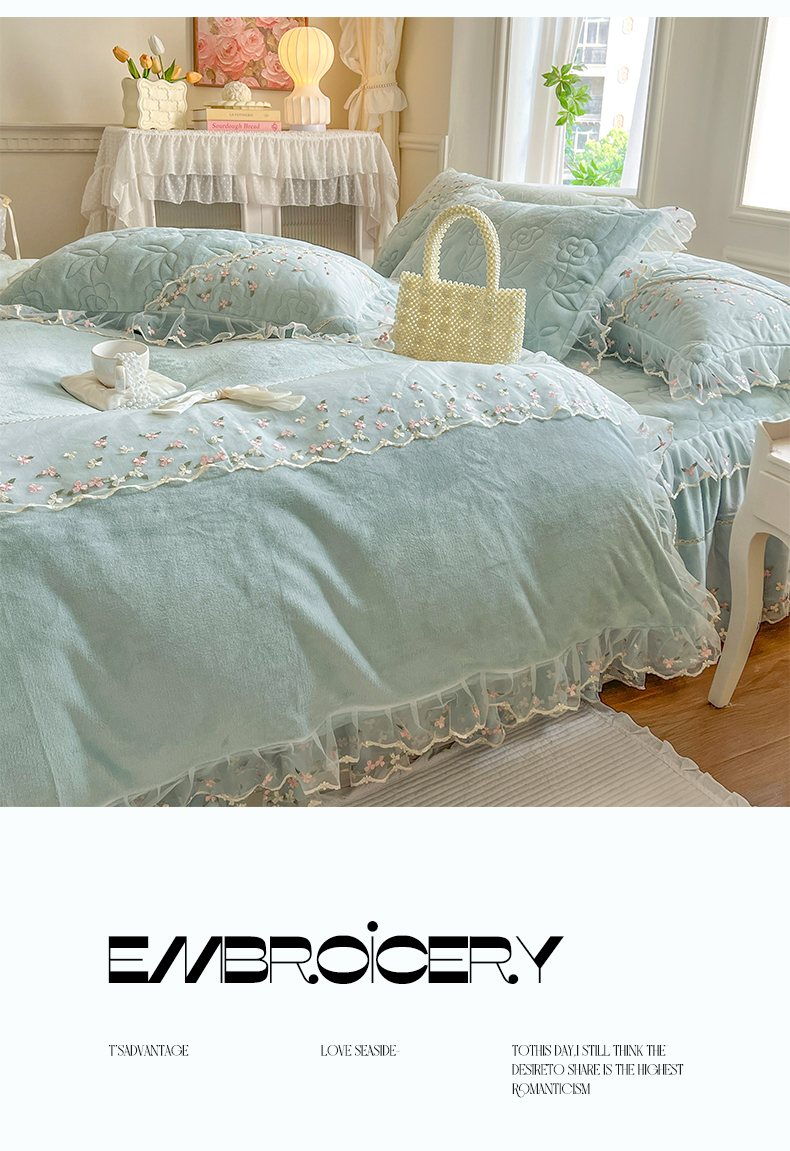 当前位置: 91家纺网 > 商品网购 > 床品套件 > 四件套 > 牛奶绒四件套 > 网红馆(ck家纺) 2025新款加厚保暖高克重牛奶绒蕾丝花边床裙款恬星系列四件套 恬星-云水蓝