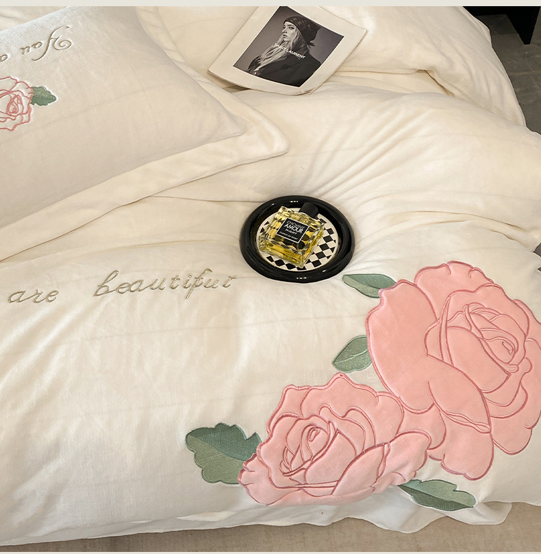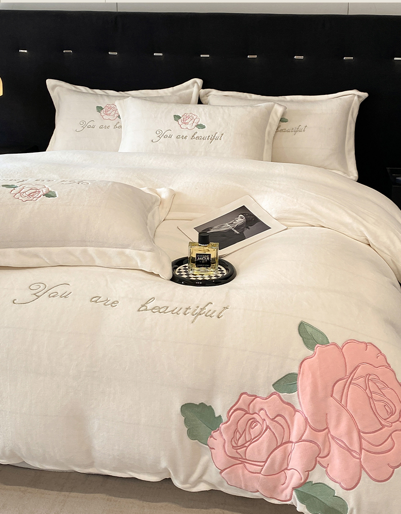 你好美丽 刺绣款200克牛奶绒四件套(含买家秀)花香四溢粉,花香四溢粉