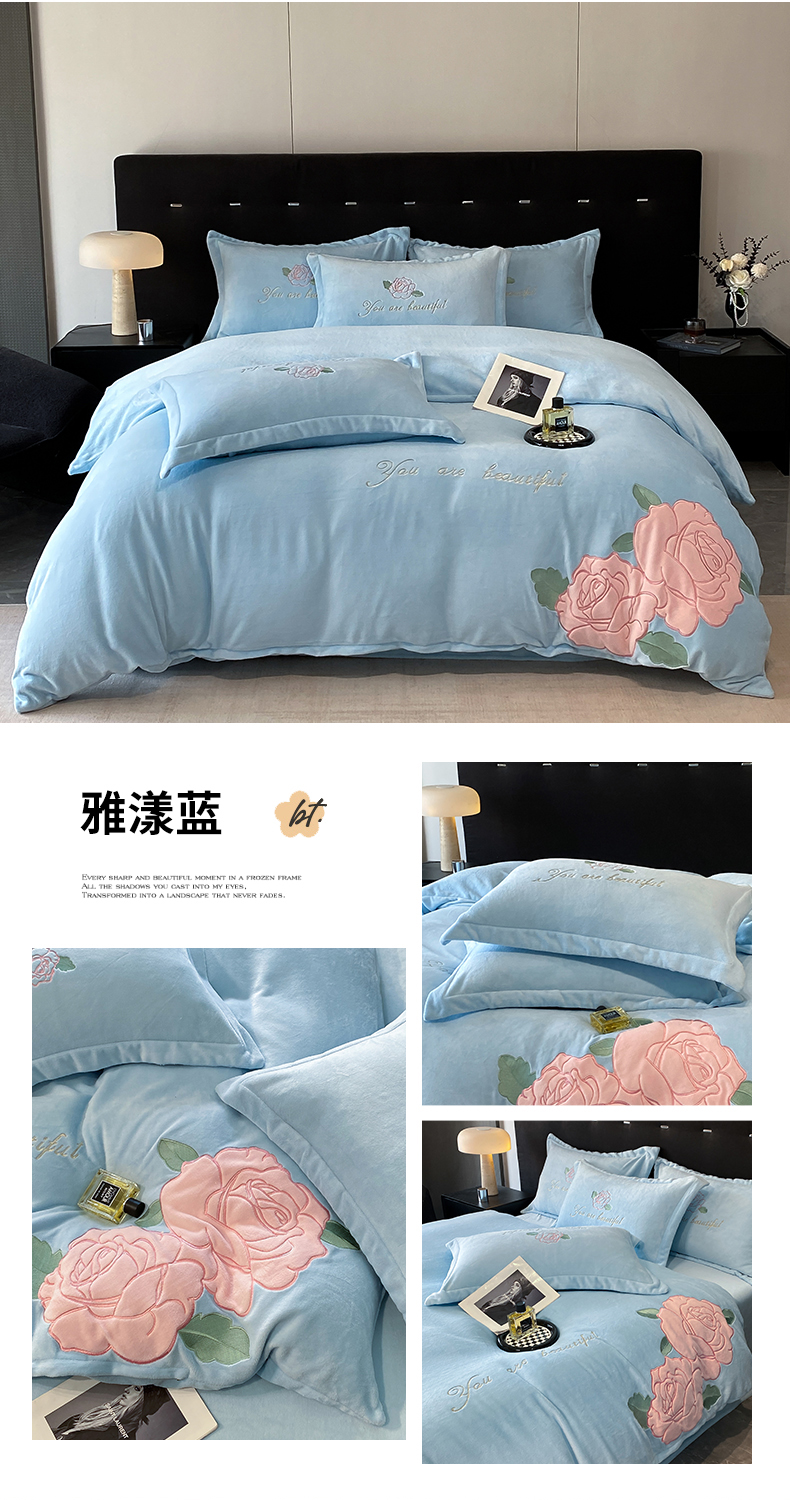 你好美丽 刺绣款200克牛奶绒四件套(含买家秀)花香四溢蓝,花香四溢蓝