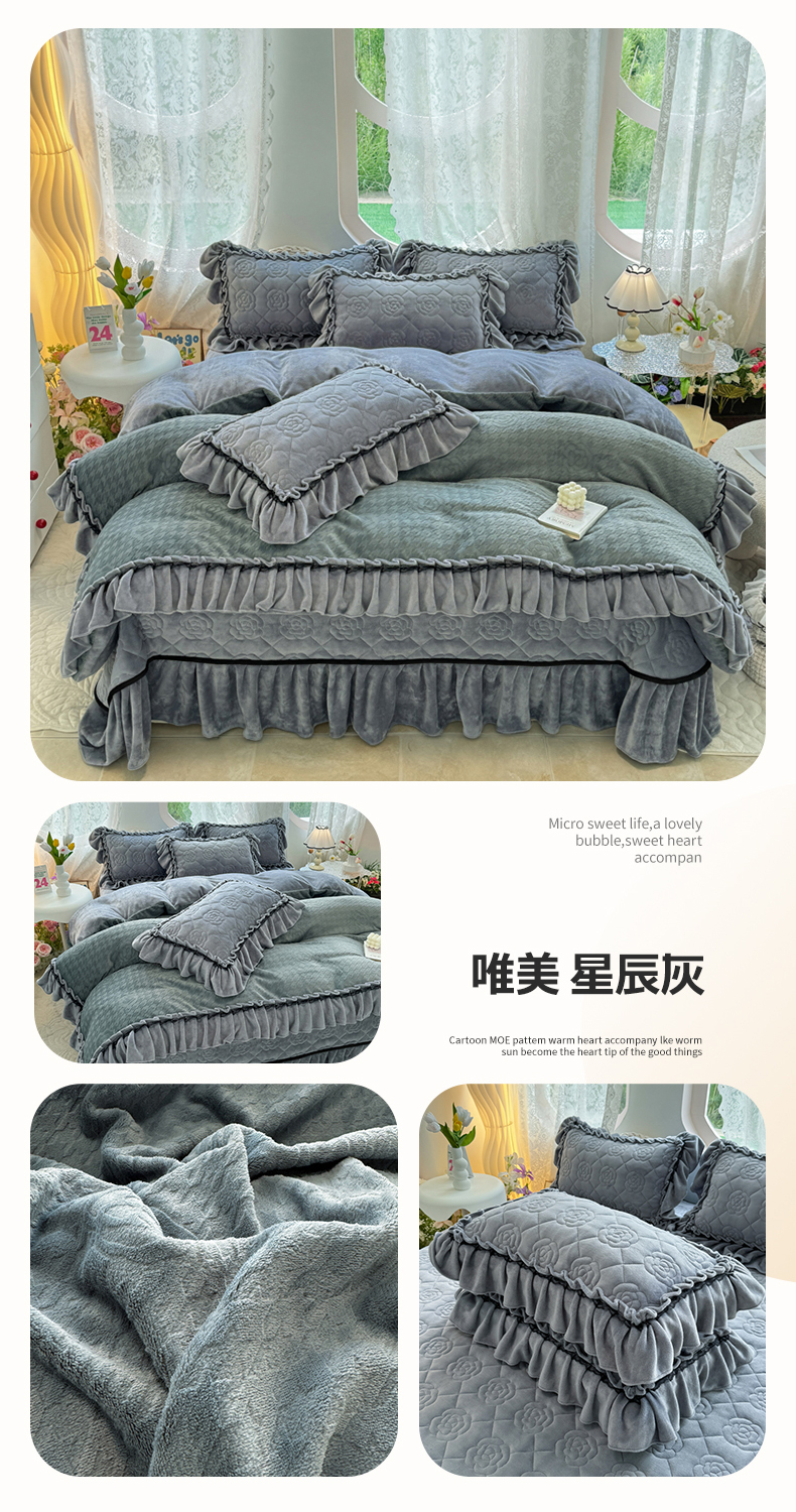 当前位置: 91家纺网 > 商品网购 > 床品套件 > 四件套 > 牛奶绒四件套 > 铠畅家纺 2025新款牛奶绒花边床盖四件套-唯美 唯美星辰灰