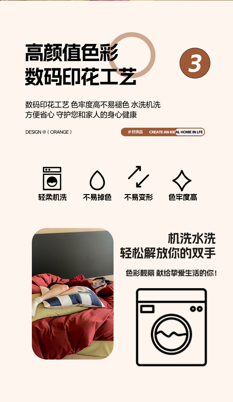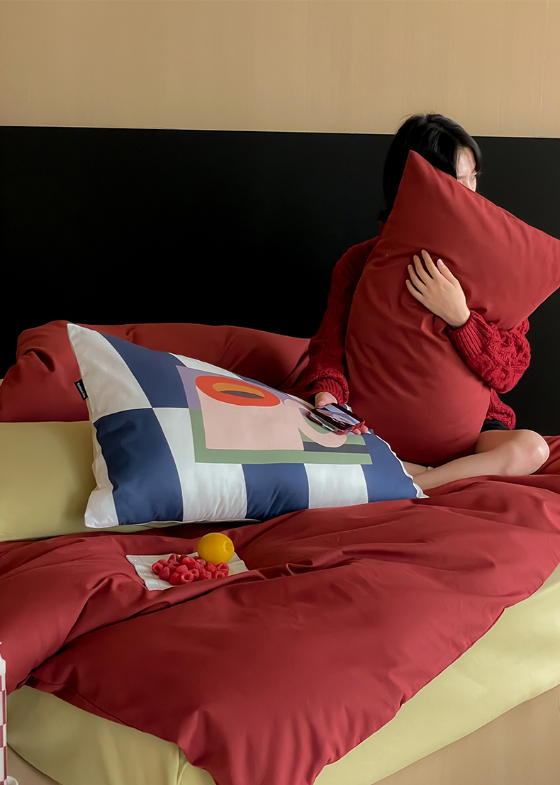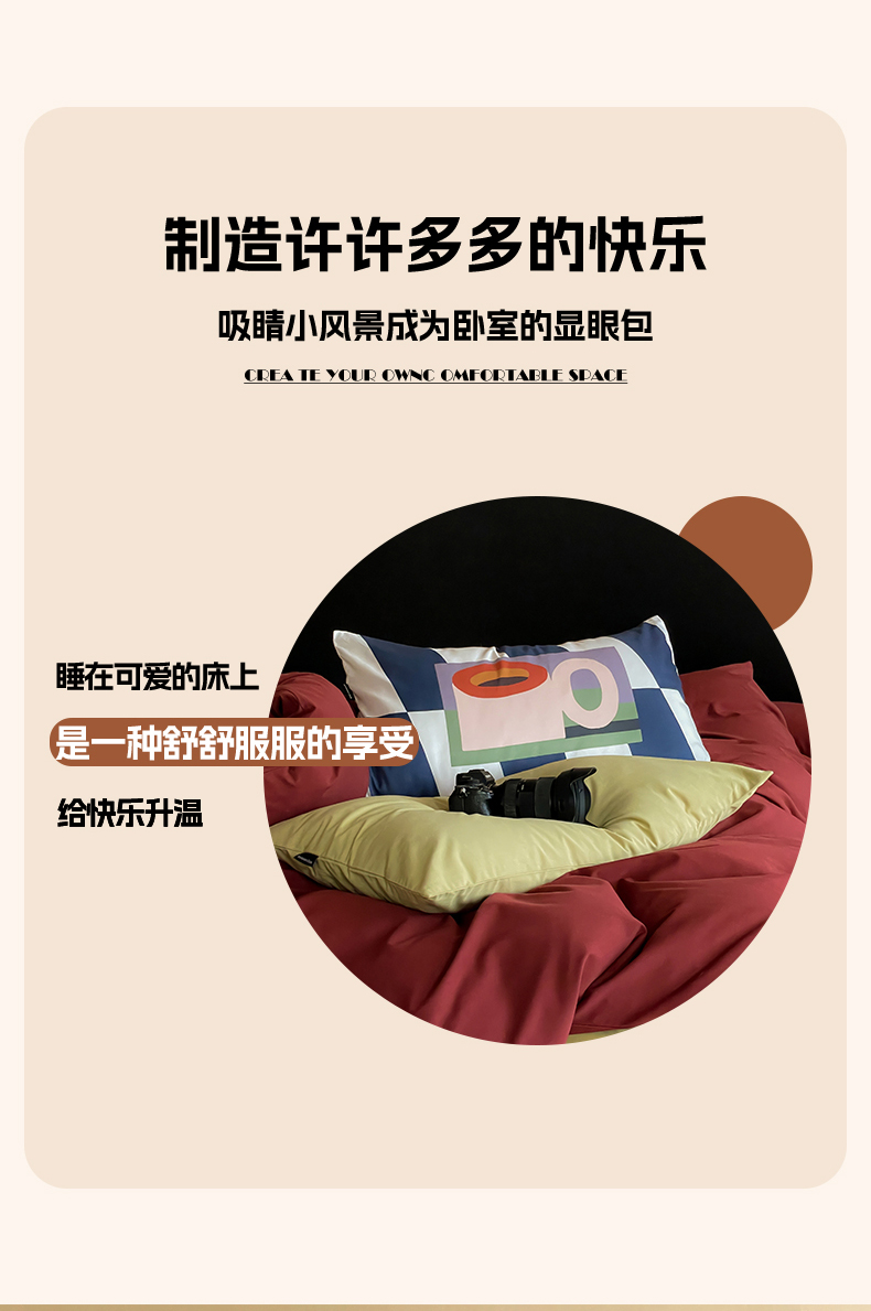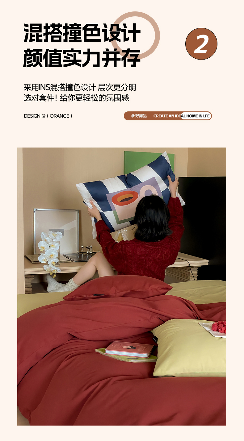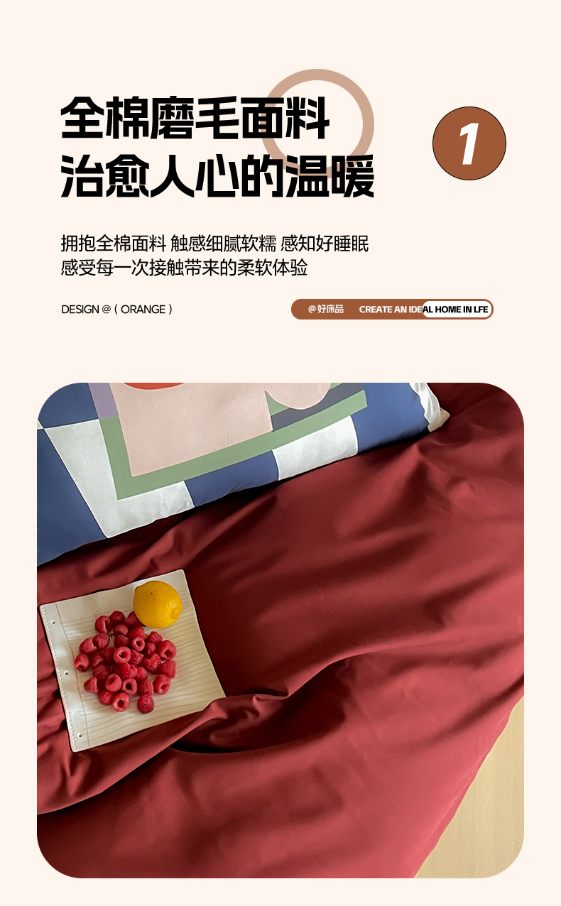 商品名称:圆岛家纺 2024秋冬新款纯色孟菲斯博主风时尚全棉磨毛五件套 洛可红拼尼罗绿