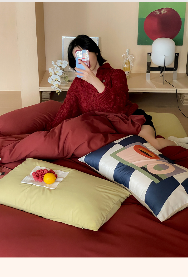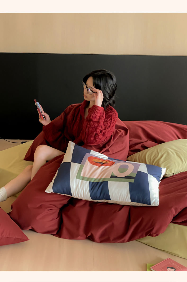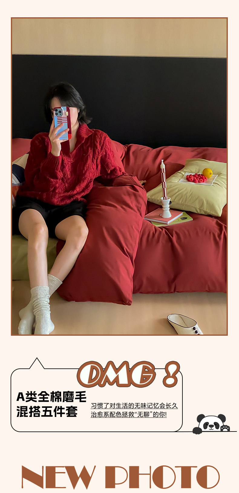 圆岛家纺 2024秋冬新款纯色孟菲斯博主风时尚全棉磨毛五件套 洛可红拼尼罗绿